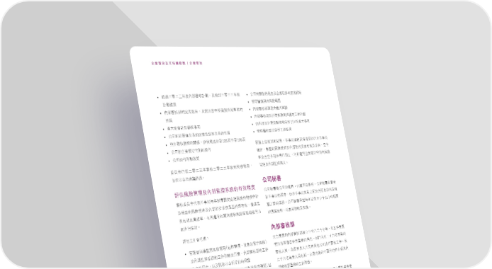 企業管治及可持續發展 | 企業管治 • ஷཀɚཧɚɧϋܓʫᄲࣨࠇྌdʿᏨীɚཧɚɚϋܓ • ʮ̡ϞᗫৌਕజѓʿΥҏٙϞࣖܓ ࠇྌආܓ • ၍ଣᄴᗆйٙࠬᎈᇍఖ • ʫᄲ֛ࣨٙಂజѓdʿ༆ӔʕהᗆйОԫධٙ • ʫᄲࣨිజٙࠠɽࠬᎈ ආ࢝ • ʫᄲࣨʿ̮໌ࣨᅰࢪܔᙄٙʈЪࠇྌ • ࠠɽٙึࠇʿᄲࣨԫධ • ͟ʫʿ̮໌ࣨᅰࢪజѓהˏ̈ٙࠠɽԫධ • ʮ̡࿁ᗫஹʹٙ݁ഄʿ༈ഃʹٙሯ • ၍ଣᄴ္ٙછІ൙ʈЪഐ؈ • ၾ̮໌ࣨᅰࢪٙᗫڷd༉ઋ༱ࠑୋ105ࠫЇୋ106ࠫ • ʮ̡࿁Άุ၍طςۆٙ፭ς ࣬ኽɪࠑᏨীٙഐ؈dԫ҅ᆽ֛Ͼ၍ଣᄴ͵ʊΣԫ҅ • ʮ̡ٙςۆձ݁ഄ ᆽ֛dණྠٙࠬᎈ၍ଣʿʫ္છӻ୕Ϟࣖʿԑd˲Ό ϋʿٜЇ͉జѓࣣ˚ಂ˟dѩϞ፭ςΆุ၍طςۆٙࠬᎈ ։ࡰึʊίɚཧɚɧϋᄲࣨɚཧɚɚϋܓٙৌਕజڌd ၍ଣʿʫ္છૢ˖f ԨΣԫ҅ܔᙄஷཀf 公司秘書 ൙Пࠬᎈ၍ଣʿʫ္છӻ୕ٙϞࣖܓ ʮ̡।ࣣ݊ʮ̡ٙ྇ࡰd͟ԫ҅։fʮ̡।ࣣࠋபτ ᄲࣨ։ࡰึ˾ڌԫ҅ӊϋఱණྠ࿁ஈଣࠬᎈၾৌਕึࠇ રԫ҅ٙҏdڮආԫ҅ϓࡰʘගʿၾٰ؇ձၾ၍ଣ ʿజѓٙࠬᎈ၍ଣʿʫ္છӻ୕݊щܵᚃϞࣖeᐄ༶݊ ᄴʘගٙ๖ஷfʮ̡।ࣣוፕӊϋટաЇˇɤʞʃࣛᗫ щϞࣖʿబࣖଟeϞщ፭ςϞᗫجձࠬᎈ၍ଣᔖঐഃ˙ ٙਖ਼ุd˸һอҦঐʿٝᗆf ࠦආБᏨীf ൙ПʈЪึϽᅇj 內部審核部 • ၍ଣᄴܵᚃ္࿀ࠬᎈ၍ଣ€ܼ̍ᐑྤeٟึʿ၍طࠬᎈ ˄̚ණྠٙʫᄲࣨணͭЇʦʊɚɤɖϋdί္છණྠ ၍ط˙ࠦዄڢ੬ࠠࠅٙԉЍfژϞɚɤʬΤਖ਼ุٙ ʿʫ္છӻ୕ٙʈЪᇍᖚʿሯ९eʫᄲࣨٙʈЪ ᄲࣨɛࡰdމණྠʿ˄̚ණྠՉ˼ʮ̡ආБᄲࣨʈЪf༈ ʿϞࣖܓd˸ʿৌਕԫהԶٙڭᗇ • ІɪϣᏨীܝdࠠɽࠬᎈٙሯʿᘌࠠܓٙᔷᜊ€̍ ɚɤʬΤਖ਼ุɛࡰܼ̍ɓ˕ਿήணʕʫήШΣ࠰ಥʫ ᄲࣨිజٙʈЪඟͼf ܼᐑྤeٟึʿ၍طࠬᎈd˸ʿණྠᏐ˹Չุਕʿ̮ ίᐑྤᔷᜊٙঐɢ ʫᄲࣨίʔცፔ༔၍ଣᄴٙઋرɨٜટΣᄲࣨ։ࡰึ • ္છഐ؈ᐏෂ༺ٙܓʿ᎖ܓd˸ک։ࡰึఱණྠ ිజdԨீཀᄲࣨ։ࡰึΣԫ҅ිజf༈ژίੂБᔖ ္ٙછًرʿࠬᎈ၍ଣٙϞࣖܓආБଢ଼ጐ൙П ਕࣛd̙ʔաࠢՓήટᙃණྠהϞᇍᖚุٙਕఊЗe༟ • ಂʫОࣛࡉ೯ତٙࠠɽ္છ̰Ⴌא္છࢮධϣᅰdʿ ପeߏʿᔖࡰf ΪϤኬߧ͊ঐཫԈٙܝ؈אၡܢઋرٙᘌࠠܓdϾவ ༈ژၾᄲࣨ։ࡰึᏨীʿᙄ֛ϋܓʫᄲࣨʈЪࠇྌ Ԭܝ؈אઋر࿁ʮ̡ٙৌਕڌତאًرʊପ͛e̙ঐ ձ༟๕༶͜f ʊପ͛אਗ਼Ը̙ঐึପ͛ٙࠠɽᅂᚤ 104