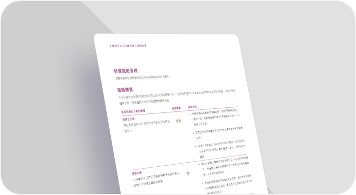 企業管治及可持續發展 | 風險管理 財務風險管理 Ϟᗫණྠٙৌਕࠬᎈ၍ଣ˙০ৌਕజڌڝൗ2ᙕࠑf 風險概覽 ɨڌΐࠑ˄̚ήପٙࠬᎈ฿ر€ܲՉߵ˖ᙇΤනҏΐ̈dܼ̍ҢࡁႩމʮ̡ࠦ࿁ٙ˴ࠅତϞʿอओତٙࠬᎈe̙ঐ̈ତٙ ஹ੭ᅂᚤeࠬᎈᒈැʿତϞאྌʕٙᇠ༆ણ݄f 現有風險及可能的影響 風險趨勢 緩解措施 品牌及形象 • Փ֛Κዚ๖ஷձٟʹద݁ഄdԨ֛ಂһอձ༊d ೌجၪܵۜήЗʿႩٝܓ̙ঐۂࢮҢࡁٙ ᆽڭɓߧeࠋபձጐΫᏐ€ܼ̍ஈଣࠠɽԫd˸ ᘩنɢf ၪᚐʮ̡ڦᚑf • ၡ္࿀ٟʹద˸ආБ൙ПԨΫᏐࠋٟࠦٙʹద ৃࢹf • ၾୋɧ˙ટᙃ˸ə༆˼ࡁ࿁ʮ̡ٙجdԨཫତࣛ ʿ̙ঐʔлҢࡁڦᚑٙe݁طeٟึאᐑྤ ᙄᕚf 業務中斷 • Փ֛০࿁ࠠɽԫุ݂ٙਕܨూࠇྌd˸ʿ০࿁ࡈйઋ ɛމԫאІ್Өኬߧٙᘌุࠠਕʕᓙ̙ ྤeᐄ༶ၡܢԫ݂ʿੰၾτΌٙՉ˼ุਕΥણ ঐ࿁ʮ̡ிϓࠋࠦৌਕᅂᚤf ݄dԨ֛ಂһอձ༊f • Փ֛ᅺЪҏձܸˏᏐ࿁ޥઋdᆽڭҢࡁٙఙה ආБ࿏ֵᆎʿऊݭiᘌࣸ፭ςִ݁࿁ޥઋאٟʹ൷ ᕎٙࠅӋձܸˏf • ֛ಂᏨൖഄଫࠇྌ˸ڭุܵਕਿᓾᖢʿՉ̙ܵ ᚃf • ආБତఙሜݟԨፔ༔ਖ਼จԈd˸ᆽڭЗήቤʿᒷ ࠬ੭ٙيุୌΥᗫٙܔጘςۆձτΌᅺf • ᒅ൯ڭᎈ˸း̙ঐᏎΪيุฦ์eุਕʕᓙʿୋɧ ˙பிϓٙৌਕฦ̰f ࠬᎈ˥̻ɚཧɚɚϋʫɪʺ ࠬᎈ˥̻ɚཧɚɚϋʫɨࠥ ࠬᎈ˥̻ɽߧၪܵʔᜊ 110