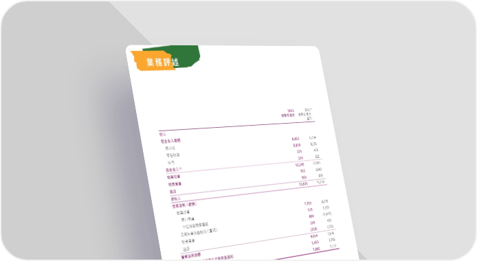 業務評述 (2) 2022 2021 港幣百萬元 ಥ࿆ϵຬʩ ࠠΐ 收入 租金收入總額 c፬ʮᅽ 6,003 6,214 cཧਯيุ 5,849 6,191 cИσ 374 474 其他收入(1) 114 102 物業投資 12,340 12,981 物業買賣 921 2,443 酒店 565 894 總收入 13,826 16,318 營業溢利/(虧損) cيุҳ༟ ccԸІᐄ༶ 7,702 8,278 cc̈ਯҳ༟يุᛆू 571 1,185 cҳ༟يุП࠽ϗूā€ᑦฦ 801 (1,947) cيุ൯ር 209 492 cৢֳ (259) (174) 營業溢利總額 9,024 7,834 應佔合資公司及聯屬公司除稅後溢利 1,455 1,786 公司股東應佔溢利 7,980 7,112 (1) Չ˼ϗɝ˴ࠅމ܊߹၍ଣ൬f (2) ΪᏐყৌਕజѓۆ༆ᙑ։ࡰึҭࡘᗫ˜̈ॡɛеৰॡ༣˹ಛᕘٙᙄӔ֛€ყৌਕజѓۆୋ9ձყৌਕజѓۆୋ16 ™ˏߧٙึࠇ݁ഄҷᜊdɚཧɚɓϋٙˢ༰ᅰኽΪʊࠠΐi༉ઋሗਞቡৌਕజڌڝൗ1(c)f ˸ɨٙڝ̋༟ࣘԶʮٰ̡؇ᏐЦٙяజ๐лၾਿ͉๐лٙ࿁ሪdϤഃ࿁ሪධͦ˴ࠅ݊ఱҳ༟يุП࠽ᜊਗଋᕘʿʕʫ ήձߕٙᗫַධd˸ʿՉ˼Ϟᗫҳ༟يַุٙධᅡ௪Ъ̈ሜfɚཧɚɚϋdණྠίʕʫήձߕٙҳ༟ يุʱйيุП࠽ϗूଋᕘಥ࿆ɚɤʞᄂཧɧϵຬʩʿಥ࿆ɧᄂɞɷɘϵຬʩdϾ࠰ಥٙҳ༟يุۆيุП࠽ᑦ ฦଋᕘಥ࿆ɤɓᄂʬɷʬϵຬʩf̤މऊৰɓධڢછٰᛆूኹϞ٫הܵႩاಂᛆᗫࠋවʮ̻࠽ᜊਗʘᅂᚤЪආɓӉሜ fᓥᗳމҳ༟يุٙԴ͜ᛆ༟ପʘᛅቖࠇɝਿ͉๐лf 32
