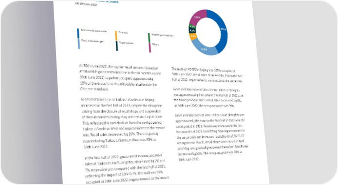 The chart below shows the mix of the tenants of the retail properties by the principal nature of their businesses (based on internal classifications) as a percentage of the retail area at 30th June 2022. Retail Area by Tenants’ usinesses At th June 19.5% 2.5% 42.8% 4.5% Fashion and accessories Cinemas Jewellery and watches 5.3% Food and beverages Supermarkets Others 25.4% At 30th June 2022, the top ten retail tenants (based on The mall at INDIGO in Beijing was 100% occupied at attributable gross rental income in the six months ended 30th June 2022. Retail sales decreased by 25% in the first 30th June 2022) together occupied approximately half of 2022. Improvements were made to the tenant mix. 18% of the Group’s total attributable retail area in the Chinese Mainland. Gross rental income at Sino-Ocean Taikoo Li Chengdu was approximately the same in the first half of 2022 as in Gross rental income at Taikoo Li Sanlitun in Beijing the same period in 2021. Retail sales decreased by 8%. increased in the first half of 2022, despite the disruption At 30th June 2022, the occupancy rate was 96%. arising from the closure of retail shops and suspension of dine-in services during May and certain days in June. Gross rental income at HKRI Taikoo Hui in Shanghai was This reflected the contribution from the newly opened approximately the same in the first half of 2022 as in the Taikoo Li Sanlitun West and improvements to the tenant same period in 2021. Retail sales increased in the first mix. Retail sales decreased by 26%. The occupancy two months of 2022, benefitting from improvements to rate including Taikoo Li Sanlitun West was 98% at the tenant mix and increased footfall until a COVID-19 30th June 2022. resurgence in March. Retail shops were closed in April and May, and gradually reopened thereafter. Retail sales In the first half of 2022, gross rental income and retail decreased by 53%. The occupancy rate was 98% at sales at Taikoo Hui in Guangzhou decreased by 2% and 30th June 2022. 7% respectively as compared with the first half of 2021, reflecting the impact of COVID-19. The mall was 99% occupied at 30th June 2022. Improvements to the tenant mix were made. 29
