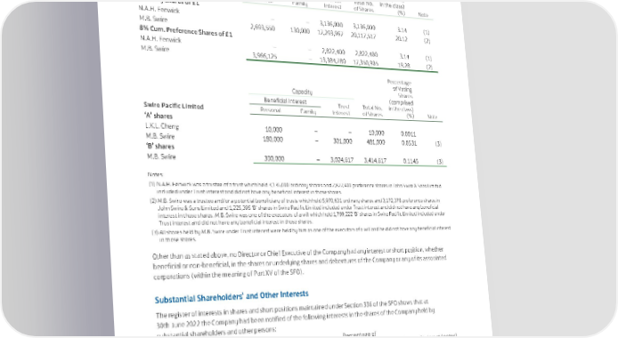 SUPPLEMENTARY INFORMATION Directors’ Interests (continued) Percentage of Issued Capacity Share Capital Beneficial Interest (comprised John Swire & Sons Limited Trust Total No. in the class) Personal Family Interest of Shares (%) Note Ordinary Shares of £1 N.A.H. Fenwick – – 3,136,000 3,136,000 3.14 (1) M.B. Swire 2,693,550 130,000 17,293,967 20,117,517 20.12 (2) 8% Cum. Preference Shares of £1 N.A.H. Fenwick – – 2,822,400 2,822,400 3.14 (1) M.B. Swire 3,966,125 – 13,384,780 17,350,905 19.28 (2) Percentage of Voting Capacity Shares Beneficial Interest (comprised Swire Pacific Limited Trust Total No. in the class) Personal Family Interest of Shares (%) Note ‘A’ shares L.K.L. Cheng 10,000 – – 10,000 0.0011 M.B. Swire 180,000 – 301,000 481,000 0.0531 (3) ‘B’ shares M.B. Swire 390,000 – 3,024,617 3,414,617 0.1145 (3) Notes: (1) N.A.H. Fenwick was a trustee of a trust which held 3,136,000 ordinary shares and 2,822,400 preference shares in John Swire & Sons Limited included under Trust interest and did not have any beneficial interest in those shares. (2) M.B. Swire was a trustee and/or a potential beneficiary of trusts which held 5,970,631 ordinary shares and 3,172,378 preference shares in John Swire & Sons Limited and 1,225,395 ‘B’ shares in Swire Pacific Limited included under Trust interest and did not have any beneficial interest in those shares. M.B. Swire was one of the executors of a will which held 1,799,222 ‘B’ shares in Swire Pacific Limited included under Trust interest and did not have any beneficial interest in those shares. (3) All shares held by M.B. Swire under Trust interest were held by him as one of the executors of a will and he did not have any beneficial interest in those shares. Other than as stated above, no Director or Chief Executive of the Company had any interest or short position, whether beneficial or non-beneficial, in the shares or underlying shares and debentures of the Company or any of its associated corporations (within the meaning of Part XV of the SFO). Substantial Shareholders’ and Other Interests The register of interests in shares and short positions maintained under Section 336 of the SFO shows that at 30th June 2022 the Company had been notified of the following interests in the shares of the Company held by substantial shareholders and other persons: Percentage of Long position Number of Shares Voting Shares (%) Type of Interest (notes) Swire Pacific Limited 4,796,765,835 82.00 Beneficial owner (1) John Swire & Sons Limited 4,796,765,835 82.00 Attributable interest (2) Notes: (1) Swire Pacific Limited was interested in 4,796,765,835 shares of the Company as beneficial owner. (2) John Swire & Sons Limited and its wholly owned subsidiary John Swire & Sons (H.K.) Limited were deemed to be interested in a total of 4,796,765,835 shares of the Company, in which Swire Pacific Limited was interested, by virtue of the John Swire & Sons Limited group being interested in 57.89% of the equity of Swire Pacific Limited and controlling 66.24% of the voting rights attached to shares in Swire Pacific Limited. 74 Swire Properties Limited Interim Report 2022