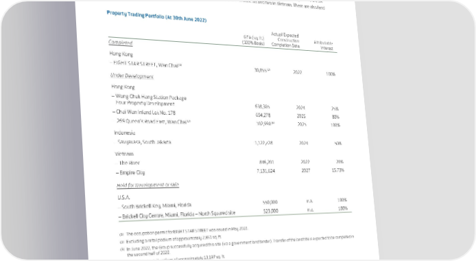 REVIEW OF OPERATIONS Property Trading Overview The trading portfolio comprises completed units available for sale at EIGHT STAR STREET in Hong Kong. There are six residential projects under development, three in Hong Kong, one in Indonesia and two in Vietnam. There are also land banks in Miami, U.S.A. Property Trading Portfolio (At 30th June 2022) Actual/Expected GFA (sq. ft.) Construction Attributable (100% Basis) Completion Date Interest Completed Hong Kong (1) (2) – EIGHT STAR STREET, Wan Chai 30,855 2022 100% Under Development Hong Kong – Wong Chuk Hang Station Package Four Property Development 638,305 2024 25% – Chai Wan Inland Lot No. 178 694,278 2025 80% (3) (4) – 269 Queen’s Road East, Wan Chai 102,990 2025 100% Indonesia – Savyavasa, South Jakarta 1,122,728 2024 50% Vietnam – The River 846,201 2022 20% – Empire City 7,131,624 2027 15.73% Held for Development or sale U.S.A. – South Brickell Key, Miami, Florida 550,000 n.a. 100% – Brickell City Centre, Miami, Florida – North Squared site 523,000 n.a. 100% (1) The occupation permit for EIGHT STAR STREET was issued in May 2022. (2) Excluding a retail podium of approximately 2,851 sq. ft. (3) In June 2022, the Group successfully acquired this site (via a government land tender). Transfer of the land title is expected to be completed in the second half of 2022. (4) Excluding a retail podium of approximately 13,197 sq. ft. 36 Swire Properties Limited Interim Report 2022