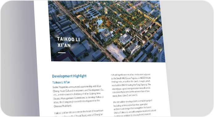 REVIEW OF OPERATIONS TAIKOO LI XI’AN Development Highlight cultural significance to Xi’an. It is located adjacent to the Small Wild Goose Pagoda, a UNESCO World Taikoo Li Xi’an Heritage site, as well as the Jianfu Temple, which Swire Properties announced a partnership with Xi’an was built in 684 AD during the Tang Dynasty. The Cheng Huan Cultural Investment and Development Co., site enjoys a good transportation network and is Ltd., a state-owned subsidiary of Xi’an Qujiang New conveniently located at the intersection of two District Management Committee, to develop Taikoo Li metro lines (Line 2 and Line 5). Xi’an, the Company’s seventh development in the The site will be developed into a retail-led project Chinese Mainland. featuring an innovative low-rise, open-plan Taikoo Li Xi’an sits on a site in the heart of downtown architectural design that exemplifies the brand Xi’an – at the south of Youyi Road, west of Chang’an DNA of Taikoo Li, and will comprise retail and cultural Road, north of Stadium North Road and east of facilities in addition to a luxury hotel, serviced Zhuque Street in Beilin district, with a total site area residences and business apartments. The estimated of approximately 1.3 million square feet. The site is gross floor area is approximately 3.0 million square located within the Small Wild Goose Pagoda historical feet (above ground and underground), subject to and cultural zone, a scenic area that has historical and further planning. The project is expected to be completed in 2025. 40 Swire Properties Limited Interim Report 2022