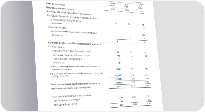 Consolidated Statement of Other Comprehensive Income For the six months ended 30th June 2022 – unaudited Unaudited Audited Six months ended Year ended 30th June 31st December 2022 2021 2021 HK$M HK$M HK$M Profit for the period 4,437 2,090 7,289 Other comprehensive income Items that will not be reclassified to profit or loss Revaluation of properties previously occupied by the Group – gains recognised during the period – 54 94 – deferred tax – – (4) Defined benefit plans – remeasurement losses recognised during the period – – (26) – deferred tax – – 4 – 54 68 Items that may be reclassified subsequently to profit or loss Cash flow hedges – gains/(losses) recognised during the period 58 (49) (38) – transferred (from)/to net finance charges (4) 5 14 – transferred from operating profit (1) – – – deferred tax (9) 7 4 Share of other comprehensive income of joint venture and associated companies (924) 233 561 Net translation differences on foreign operations recognised during the period (1,686) 459 1,095 (2,566) 655 1,636 Other comprehensive income for the period, net of tax (2,566) 709 1,704 Total comprehensive income for the period 1,871 2,799 8,993 Total comprehensive income attributable to: The Company’s shareholders 1,790 2,684 8,802 Non-controlling interests 81 115 191 1,871 2,799 8,993 The above consolidated statement of other comprehensive income should be read in conjunction with the accompanying notes. 51
