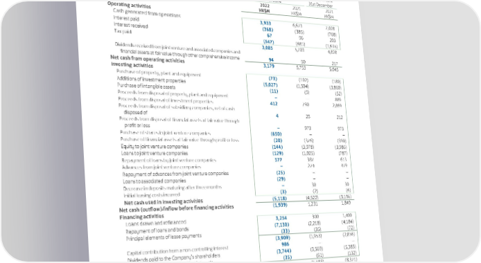 Consolidated Statement of Cash Flows For the six months ended 30th June 2022 – unaudited Unaudited Audited Six months ended Year ended 30th June 31st December 2022 2021 2021 HK$M HK$M HK$M Operating activities Cash generated from operations 3,933 6,673 7,028 Interest paid (368) (385) (768) Interest received 67 96 203 Tax paid (547) (681) (1,635) 3,085 5,703 4,828 Dividends received from joint venture and associated companies and financial assets at fair value through other comprehensive income 94 50 217 Net cash from operating activities 3,179 5,753 5,045 Investing activities Purchase of property, plant and equipment (73) (102) (180) Additions of investment properties (5,027) (1,504) (3,860) Purchase of intangible assets (11) (9) (52) Proceeds from disposal of property, plant and equipment – – 889 Proceeds from disposal of investment properties 412 790 2,869 Proceeds from disposal of subsidiary companies, net of cash disposed of 4 20 212 Proceeds from disposal of financial assets at fair value through profit or loss – 973 973 Purchase of shares in joint venture companies (650) – – Purchase of financial assets at fair value through profit or loss (20) (376) (390) Equity to joint venture companies (144) (3,978) (3,986) Loans to joint venture companies (129) (1,025) (787) Repayment of loans by joint venture companies 577 387 613 Advances from joint venture companies – 274 479 Repayment of advances from joint venture companies (25) – – Loans to associated companies (29) – – Decrease in deposits maturing after three months – 30 30 Initial leasing costs incurred (3) (2) (6) Net cash used in investing activities (5,118) (4,522) (3,196) Net cash (outflow)/inflow before financing activities (1,939) 1,231 1,849 Financing activities Loans drawn and refinanced 3,254 300 1,400 Repayment of loans and bonds (7,130) (2,218) (4,184) Principal elements of lease payments (33) (35) (72) (3,909) (1,953) (2,856) Capital contribution from a non-controlling interest 986 – – Dividends paid to the Company’s shareholders (3,744) (3,569) (5,383) Dividends paid to non-controlling interests (35) (61) (132) Net cash used in financing activities (6,702) (5,583) (8,371) Decrease in cash and cash equivalents (8,641) (4,352) (6,522) Cash and cash equivalents at 1st January 14,833 21,202 21,202 Effect of exchange differences (279) 67 153 Cash and cash equivalents at end of the period 5,913 16,917 14,833 Represented by: Bank balances and short-term deposits maturing within three months 5,913 16,917 14,833 The above consolidated statement of cash flows should be read in conjunction with the accompanying notes. 53