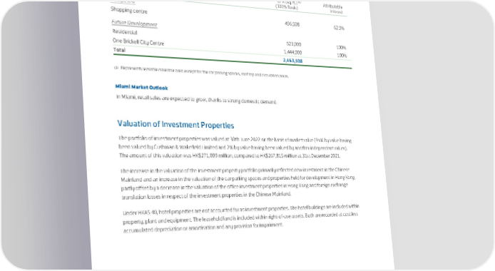 The second phase of the Brickell City Centre development, to be known as One Brickell City Centre, is being planned. It will be a commercial development connecting to the first phase of Brickell City Centre. Brickell City Centre, Miami (1) GFA (sq. ft.) Attributable (100% Basis) Interest Completed Shopping centre 496,508 62.9% Future Development Residential 523,000 100% One Brickell City Centre 1,444,000 100% Total 2,463,508 (1) Represents leasable/saleable area except for the car parking spaces, roof top and circulation areas. Miami Market Outlook In Miami, retail sales are expected to grow, thanks to strong domestic demand. Valuation of Investment Properties The portfolio of investment properties was valued at 30th June 2022 on the basis of market value (95% by value having been valued by Cushman & Wakefield Limited and 2% by value having been valued by another independent valuer). The amount of this valuation was HK$271,009 million, compared to HK$267,815 million at 31st December 2021. The increase in the valuation of the investment property portfolio primarily reflected new investment in the Chinese Mainland and an increase in the valuation of the car parking spaces and properties held for development in Hong Kong, partly offset by a decrease in the valuation of the office investment properties in Hong Kong and foreign exchange translation losses in respect of the investment properties in the Chinese Mainland. Under HKAS 40, hotel properties are not accounted for as investment properties. The hotel buildings are included within property, plant and equipment. The leasehold land is included within right-of-use assets. Both are recorded at cost less accumulated depreciation or amortisation and any provision for impairment. 35