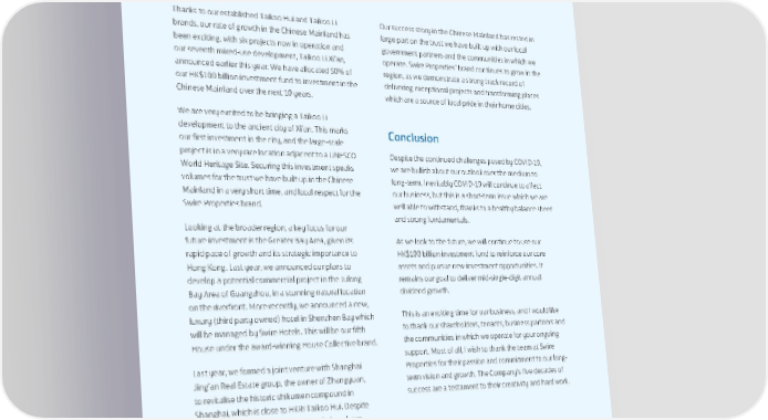 Thanks to our established Taikoo Hui and Taikoo Li Our success story in the Chinese Mainland has rested in brands, our rate of growth in the Chinese Mainland has large part on the trust we have built up with our local been exciting, with six projects now in operation and government partners and the communities in which we our seventh mixed-use development, Taikoo Li Xi’an, operate. Swire Properties’ brand continues to grow in the announced earlier this year. We have allocated 50% of region, as we demonstrate a strong track record of our HK$100 billion investment fund to investment in the delivering exceptional projects and transforming places Chinese Mainland over the next 10 years. which are a source of local pride in their home cities. We are very excited to be bringing a Taikoo Li development to the ancient city of Xi’an. This marks Conclusion our first investment in the city, and the large-scale project is in a very rare location adjacent to a UNESCO Despite the continued challenges posed by COVID-19, World Heritage Site. Securing this investment speaks we are bullish about our outlook over the medium to volumes for the trust we have built up in the Chinese long-term. Inevitably COVID-19 will continue to affect Mainland in a very short time, and local respect for the our business, but this is a short-term issue which we are Swire Properties brand. well able to withstand, thanks to a healthy balance sheet and strong fundamentals. Looking at the broader region, a key focus for our future investment is the Greater Bay Area, given its As we look to the future, we will continue to use our rapid pace of growth and its strategic importance to HK$100 billion investment fund to reinforce our core Hong Kong. Last year, we announced our plans to assets and pursue new investment opportunities. It develop a potential commercial project in the Julong remains our goal to deliver mid-single-digit annual Bay Area of Guangzhou, in a stunning natural location dividend growth. on the riverfront. More recently, we announced a new, luxury (third party owned) hotel in Shenzhen Bay which This is an exciting time for our business, and I would like will be managed by Swire Hotels. This will be our fifth to thank our shareholders, tenants, business partners and House under the award-winning House Collective brand. the communities in which we operate for your ongoing support. Most of all, I wish to thank the team at Swire Last year, we formed a joint venture with Shanghai Properties for their passion and commitment to our long- Jing’an Real Estate group, the owner of Zhangyuan, term vision and growth. The Company’s five decades of to revitalise the historic shikumen compound in success are a testament to their creativity and hard work. Shanghai, which is close to HKRI Taikoo Hui. Despite the resurgence of COVID-19 in Shanghai, we have been actively pushing ahead with the project, and we target to launch the first phase of Zhangyuan in the fourth quarter of 2022. In Beijing, we are making headway on INDIGO Phase Two, which is part of our masterplan to transform INDIGO into one of the best Guy Bradley performing office locations in the capital. Chairman Hong Kong, 11th August 2022 11