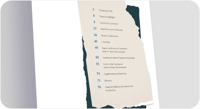 CONTENTS 2 Company Profile 8 Financial Highlights 9 Chairman’s Statement 12 Chief Executive’s Statement 16 Review of Operations 43 Financing 49 Report on Review of Condensed Interim Financial Statements 50 Condensed Interim Financial Statements 55 Notes to the Condensed Interim Financial Statements 73 Supplementary Information 75 Glossary 76 Financial Calendar and Information for Investors