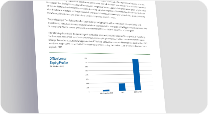 At 30th June 2022, the top ten office tenants (based on attributable gross rental income in the six months ended 30th June 2022) together occupied approximately 24% of the Group’s total attributable office area in Hong Kong. Hong Kong Office Market Outlook The office market in Hong Kong is expected to be weak in the second half of 2022, reflecting increased vacancy rates and new supply. Increasing competition from Central and Kowloon East will also exert downward pressure on rents. However, it is expected that the flight-to-quality will benefit us as prospective tenants upgrade their premises and place a higher value on sustainability and wellness in the workplace. Assuming a gradual reopening of the international border and the border with the Chinese Mainland and improvements in the financial markets, the demand for Grade-A office space, particularly from financial institutions and professional services companies, should increase. The pre-leasing of Two Taikoo Place has been making steady progress, with a commitment rate approaching 50%. In addition to Julius Baer, more strategic tenants have been secured, including one of the biggest office lease transactions on Hong Kong Island in recent years, with an anchor tenant for over 150,000 square feet of office space. The following chart shows the percentage of attributable gross rental income from the office properties in Hong Kong, for the month ended 30th June 2022, derived from leases expiring in the periods with no committed renewals or new lettings. Tenancies accounting for approximately 3.7% of the attributable gross rental income in the month of June 2022 are due to expire in the second half of 2022, with tenancies accounting for a further 17.8% of such rental income due to expire in 2023. Office Lease 80% Expiry Profile 70% (At 30th e 2022 60% 50% 40% 30% 20% 10% 0 July – December 2022 2023 2024 and later 23