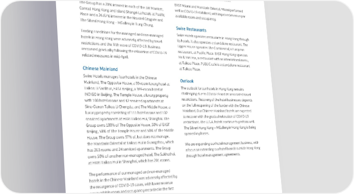 Hong Kong U.S.A. The Group wholly-owns and manages (through Swire EAST Miami at the Brickell City Centre development Hotels) two hotels in Hong Kong, The Upper House, a in Miami was sold to a third party in October 2021. 117-room luxury hotel at Pacific Place, and EAST Hong It continues to be managed by Swire Hotels. Kong, a 331-room hotel in Taikoo Shing. EAST Miami and Mandarin Oriental, Miami performed The Group has a 20% interest in each of the JW Marriott, well as COVID-19 stabilised, with improved revenue per Conrad Hong Kong and Island Shangri-La hotels at Pacific available room and occupancy. Place and a 26.67% interest in the Novotel Citygate and The Silveri Hong Kong – MGallery in Tung Chung. Swire Restaurants Trading conditions for the managed and non-managed Swire Hotels operates restaurants in Hong Kong through hotels in Hong Kong were adversely affected by travel its hotels. It also operates a standalone restaurant. The restrictions and the fifth wave of COVID-19. Business Upper House operates The Continental, a European recovered gradually following the relaxation of COVID-19 restaurant, at Pacific Place. EAST Hong Kong operates related measures in mid-April. Mr & Mrs Fox, a restaurant with an international menu, at Taikoo Place. PUBLIC café is a standalone restaurant Chinese Mainland at Taikoo Place. Swire Hotels manages four hotels in the Chinese Outlook Mainland, The Opposite House, a 99-room luxury hotel at The outlook for our hotels in Hong Kong remains Taikoo Li Sanlitun, EAST Beijing, a 369-room hotel at challenging due to COVID-19 and its associated travel INDIGO in Beijing, The Temple House, a luxury property restrictions. Recovery of the hotel businesses depends with 100 hotel rooms and 42 serviced apartments at on the full reopening of the border with the Chinese Sino-Ocean Taikoo Li Chengdu, and The Middle House, a Mainland. Our Chinese Mainland hotels are expected luxury property consisting of 111 hotel rooms and 102 to recover with the gradual relaxation of COVID-19 serviced apartments at HKRI Taikoo Hui, Shanghai. The restrictions. The U.S.A. hotels continue to perform well. Group owns 100% of The Opposite House, 50% of EAST The Silveri Hong Kong – MGallery in Hong Kong is being Beijing, 50% of The Temple House and 50% of The Middle opened in phases. House. The Group owns 97% of, but does not manage, the Mandarin Oriental at Taikoo Hui in Guangzhou, which We are expanding our hotel management business, with has 263 rooms and 24 serviced apartments. The Group a focus on extending our hotel brands outside Hong Kong owns 50% of another non-managed hotel, The Sukhothai, through hotel management agreements. at HKRI Taikoo Hui in Shanghai, which has 201 rooms. The performance of our managed and non-managed hotels in the Chinese Mainland was adversely affected by the resurgence of COVID-19 cases, with lower revenue per available room and occupancy recorded in the first half of 2022. 39