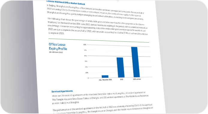 REVIEW OF OPERATIONS At 30th June 2022, the top ten office tenants (based on attributable gross rental income in the six months ended 30th June 2022) together occupied approximately 47% of the Group’s total attributable office area in the Chinese Mainland. The occupancy rates at the office towers of Taikoo Hui in Guangzhou, ONE INDIGO in Beijing and the office towers of HKRI Taikoo Hui in Shanghai were 94%, 95% and 100% respectively at 30th June 2022. Chinese Mainland Office Market Outlook In Beijing, Shanghai and Guangzhou, office demand and market sentiment are expected to recover in the second half of 2022 assuming COVID-19 restrictions continue to be relaxed. However, the continued new supply of office space in Shanghai and Guangzhou, particularly in emerging decentralised submarkets, is exerting downward pressure on rents. The following chart shows the percentage of attributable gross rental income from the office properties in the Chinese Mainland, for the month ended 30th June 2022, derived from leases expiring in the periods with no committed renewals or new lettings. Tenancies accounting for approximately 4.4% of the attributable gross rental income in the month of June 2022 are due to expire in the second half of 2022, with tenancies accounting for a further 37.4% of such rental income due to expire in 2023. Office Lease 60% Expiry Profile 50% (At 30th Jue 2022 40% 30% 20% 10% 0 July – December 2022 2023 2024 and later Serviced Apartments There are 24 serviced apartments at the Mandarin Oriental in Taikoo Hui Guangzhou, 42 serviced apartments at The Temple House in Sino-Ocean Taikoo Li Chengdu and 102 serviced apartments at The Middle House Residences in HKRI Taikoo Hui Shanghai. The performance of the serviced apartments in the first half of 2022 was adversely affected by COVID-19. Occupancy at the Mandarin Oriental in Guangzhou, The Temple House in Chengdu and The Middle House Residences in Shanghai was 92%, 90% and 66% respectively at 30th June 2022. 32 Swire Properties Limited Interim Report 2022