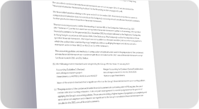 2. Basis of Preparation (a) The unaudited condensed interim financial statements have been prepared in accordance with Hong Kong Accounting Standard (“HKAS”) 34 “Interim Financial Reporting” issued by the Hong Kong Institute of Certified Public Accountants and the disclosure requirements of The Listing Rules of The Stock Exchange of Hong Kong Limited (the “Listing Rules”). The unaudited condensed interim financial statements are set out on pages 50 to 72 and also include the “Financial Information Reviewed by Auditors” in the Financing section on pages 43 to 48. The financial information relating to the year ended 31st December 2021 that is included in this document as comparative information does not constitute the Company’s statutory annual consolidated financial statements for that year but is derived from those financial statements. The non-statutory accounts (within the meaning of section 436 of the Companies Ordinance (Cap. 622) (the “Ordinance”)) in this document are not specified financial statements (within such meaning). The specified financial statements for the year ended 31st December 2021 have been delivered to the Registrar of Companies in Hong Kong in accordance with section 664 of the Ordinance. The Company’s auditor has reported on those specified financial statements. That report was not qualified or otherwise modified, did not refer to any matter to which the auditor drew attention by way of emphasis without qualifying the report and did not contain a statement under section 406(2) or 407(2) or (3) of the Ordinance. The accounting policies and methods of computation and presentation used in the preparation of the condensed interim financial statements are consistent with those described in the 2021 annual financial statements except for those noted in 2(b) and 2(c) below. (b) The following revised standards were adopted by the Group effective from 1st January 2022: Accounting Guideline 5 (Revised) Merger Accounting for Common Control Combinations Annual improvements project Annual Improvements to HKFRSs 2018-2020 Amendments to HKFRS 3, HKAS 16 and HKAS 37 Narrow-scope Amendments None of the revised standards had a significant effect on the Group’s financial statements or accounting policies. (c) The preparation of the condensed interim financial statements in conformity with HKFRS requires the use of certain critical accounting estimates. It also requires management to exercise judgements in the process of applying the Group’s accounting policies. Those areas involving a higher degree of judgements or complexity and areas where assumptions and estimates are significant to the Group’s consolidated financial statements are detailed in the 2021 annual financial statements. 57