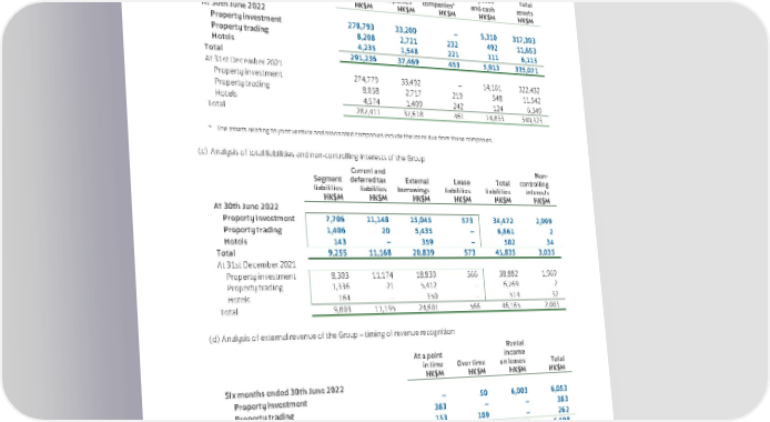 NOTES TO THE CONDENSED INTERIM FINANCIAL STATEMENTS 1. Segment Information (continued) (b) Analysis of total assets of the Group Joint Bank Segment venture Associated deposits Total assets companies* companies* and cash assets HK$M HK$M HK$M HK$M HK$M At 30th June 2022 Property investment 278,793 33,200 – 5,310 317,303 Property trading 8,208 2,721 232 492 11,653 Hotels 4,235 1,548 221 111 6,115 Total 291,236 37,469 453 5,913 335,071 At 31st December 2021 Property investment 274,779 33,492 – 14,161 322,432 Property trading 8,058 2,717 219 548 11,542 Hotels 4,574 1,409 242 124 6,349 Total 287,411 37,618 461 14,833 340,323 * The assets relating to joint venture and associated companies include the loans due from these companies. (c) Analysis of total liabilities and non-controlling interests of the Group Current and Non- Segment deferred tax External Lease Total controlling liabilities liabilities borrowings liabilities liabilities interests HK$M HK$M HK$M HK$M HK$M HK$M At 30th June 2022 Property investment 7,706 11,148 15,045 573 34,472 2,999 Property trading 1,406 20 5,435 – 6,861 2 Hotels 143 – 359 – 502 34 Total 9,255 11,168 20,839 573 41,835 3,035 At 31st December 2021 Property investment 8,303 11,174 18,839 566 38,882 1,969 Property trading 1,336 21 5,412 – 6,769 2 Hotels 164 – 350 – 514 32 Total 9,803 11,195 24,601 566 46,165 2,003 (d) Analysis of external revenue of the Group – timing of revenue recognition Rental At a point income in time Over time on leases Total HK$M HK$M HK$M HK$M Six months ended 30th June 2022 Property investment – 50 6,003 6,053 Property trading 383 – – 383 Hotels 153 109 – 262 Total 536 159 6,003 6,698 Six months ended 30th June 2021 Property investment – 50 6,197 6,247 Property trading 2,394 – – 2,394 Hotels 219 208 – 427 Total 2,613 258 6,197 9,068 There are no significant differences from the last annual financial statements in the basis of segmentation or in the basis of measurement of segment profit or loss. 56 Swire Properties Limited Interim Report 2022