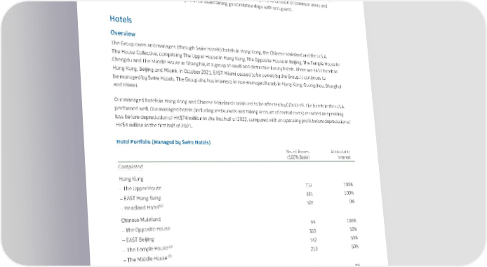 REVIEW OF OPERATIONS Estate Management The Group manages 19 residential estates which it has developed. It also manages OPUS HONG KONG, a residential property in Hong Kong which the Group redeveloped for Swire Pacific Limited. The management services include day to day assistance for occupants, management, maintenance, cleaning, security and renovation of common areas and facilities. The Group places great emphasis on maintaining good relationships with occupants. Hotels Overview The Group owns and manages (through Swire Hotels) hotels in Hong Kong, the Chinese Mainland and the U.S.A. The House Collective, comprising The Upper House in Hong Kong, The Opposite House in Beijing, The Temple House in Chengdu and The Middle House in Shanghai, is a group of small and distinctive luxury hotels. There are EAST hotels in Hong Kong, Beijing and Miami. In October 2021, EAST Miami ceased to be owned by the Group. It continues to be managed by Swire Hotels. The Group also has interests in non-managed hotels in Hong Kong, Guangzhou, Shanghai and Miami. Our managed hotels in Hong Kong and Chinese Mainland continued to be affected by COVID-19. The hotels in the U.S.A. performed well. Our managed hotels (including restaurants and taking account of central costs) recorded an operating loss before depreciation of HK$74 million in the first half of 2022, compared with an operating profit before depreciation of HK$4 million in the first half of 2021. Hotel Portfolio (Managed by Swire Hotels) No. of Rooms Attributable (100% Basis) Interest Completed Hong Kong – The Upper House 117 100% – EAST Hong Kong 331 100% (1) – Headland Hotel 501 0% Chinese Mainland – The Opposite House 99 100% – EAST Beijing 369 50% (2) – The Temple House 142 50% – The Middle House (2) 213 50% U.S.A. (3) – EAST Miami 352 0% Total 2,124 (1) Headland Hotel is owned by Airline Property Limited, a wholly-owned subsidiary of Cathay Pacific Airways Limited. (2) Comprising one hotel tower and one serviced apartment tower. (3) EAST Miami (including serviced apartments in the hotel tower) is owned by a third party. 38 Swire Properties Limited Interim Report 2022
