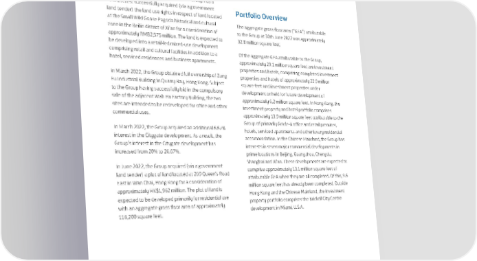 In July and August 2022, Swire Hotels announced plans Key Developments for two new, third party owned hotels under The House In January 2022, the sale of the property located at Fort Collective brand in Tokyo and Shenzhen. The two hotels Lauderdale, Florida was completed. will be managed by Swire Hotels. In March 2022, a consortium in which the Group has a 70% interest successfully acquired (via a government Portfolio Overview land tender) the land use rights in respect of land located at the Small Wild Goose Pagoda historical and cultural The aggregate gross floor area (“GFA”) attributable zone in the Beilin district of Xi’an for a consideration of to the Group at 30th June 2022 was approximately approximately RMB2,575 million. The land is expected to 32.8 million square feet. be developed into a retail-led mixed-use development comprising retail and cultural facilities in addition to a Of the aggregate GFA attributable to the Group, hotel, serviced residences and business apartments. approximately 29.1 million square feet are investment properties and hotels, comprising completed investment In March 2022, the Group obtained full ownership of Zung properties and hotels of approximately 22.9 million Fu Industrial Building in Quarry Bay, Hong Kong. Subject square feet and investment properties under to the Group having successfully bid in the compulsory development or held for future development of sale of the adjacent Wah Ha Factory Building, the two approximately 6.2 million square feet. In Hong Kong, the sites are intended to be redeveloped for office and other investment property and hotel portfolio comprises commercial uses. approximately 13.9 million square feet attributable to the In March 2022, the Group acquired an additional 6.67% Group of primarily Grade-A office and retail premises, interest in the Citygate development. As a result, the hotels, serviced apartments and other luxury residential Group’s interest in the Citygate development has accommodation. In the Chinese Mainland, the Group has increased from 20% to 26.67%. interests in seven major commercial developments in prime locations in Beijing, Guangzhou, Chengdu, In June 2022, the Group acquired (via a government Shanghai and Xi’an. These developments are expected to land tender) a plot of land located at 269 Queen’s Road comprise approximately 13.1 million square feet of East in Wan Chai, Hong Kong for a consideration of attributable GFA when they are all completed. Of this, 9.6 approximately HK$1,962 million. The plot of land is million square feet has already been completed. Outside expected to be developed primarily for residential use Hong Kong and the Chinese Mainland, the investment with an aggregate gross floor area of approximately property portfolio comprises the Brickell City Centre 116,200 square feet. development in Miami, U.S.A. 19