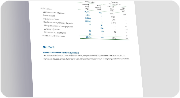 FINANCING Changes in Financing Financial Information Reviewed by Auditors Analysis of Changes in Financing Six months ended Year ended 30th June 2022 31st December 2021 Loans and Lease Loans and Lease bonds liabilities bonds liabilities HK$M HK$M HK$M HK$M At 1st January 24,601 566 27,257 580 Loans drawn and refinanced 3,254 – 1,400 – Bonds matured (3,923) – (300) – Repayment of loans (3,207) – (3,884) – New leases arranged during the period – 61 – 51 Principal elements of lease payments – (33) – (72) Currency adjustment 98 (22) 85 14 Other non-cash movements 16 1 43 (7) At 30th June/31st December 20,839 573 24,601 566 Net Debt Financial Information Reviewed by Auditors Net debt at 30th June 2022 was HK$15,499 million, compared with HK$10,334 million at 31st December 2021. The increase in net debt principally reflected capital and development expenditure in Hong Kong and the Chinese Mainland. 44 Swire Properties Limited Interim Report 2022