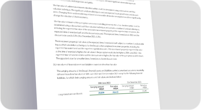 NOTES TO THE CONDENSED INTERIM FINANCIAL STATEMENTS 18. Fair Value Measurement of Financial Instruments (continued) There has been no change in valuation techniques for Level 2 and Level 3 fair value hierarchy classifications. The fair value of derivatives used for hedging in Level 2 has been based on quotes from market makers or alternative market participants supported by observable inputs. The most significant observable inputs are market interest rates, exchange rates and yields. The fair value of unlisted investments classified within Level 3 is determined using a discounted cash flow valuation technique. The significant unobservable inputs used are expected future growth rates and discount rates. Changing these unobservable inputs based on reasonable alternative assumptions would not significantly change the valuation of the investments. The fair value estimate of the put option over a non-controlling interest in the U.S.A. classified within Level 3 is determined using a discounted cash flow valuation technique and contains a number of unobservable inputs, including the expected fair value of the associated investment property at the expected time of exercise, the expected time of exercise itself and the discount rate used. The expected time of exercise is in 2023 and the discount rate used is 6.3% (31st December 2021: 6.3%). The investment property’s fair value at the expected time of exercise is itself subject to a number of unobservable inputs which are similar to the inputs for the Group’s other completed investment properties, including the expected fair market rent and the expected capitalisation rate. If the investment property’s expected fair value at the time of exercise is higher, the fair value of the put option would also be higher at 30th June 2022. If the expected time of exercise is later or if the discount rate is higher, the fair value of the put option would be lower. The opposite is true for an earlier time of exercise or a lower discount rate. (b) Fair values of financial assets and liabilities carried at other than fair value The carrying amounts of the Group’s financial assets and liabilities carried at amortised cost are not materially different from their fair values at 30th June 2022 and 31st December 2021 except for the following financial liabilities, for which their carrying amounts and fair values are disclosed below: 30th June 2022 31st December 2021 Carrying amount Fair value Carrying amount Fair value HK$M HK$M HK$M HK$M Long-term loans and bonds 20,839 20,413 24,601 25,461 66 Swire Properties Limited Interim Report 2022