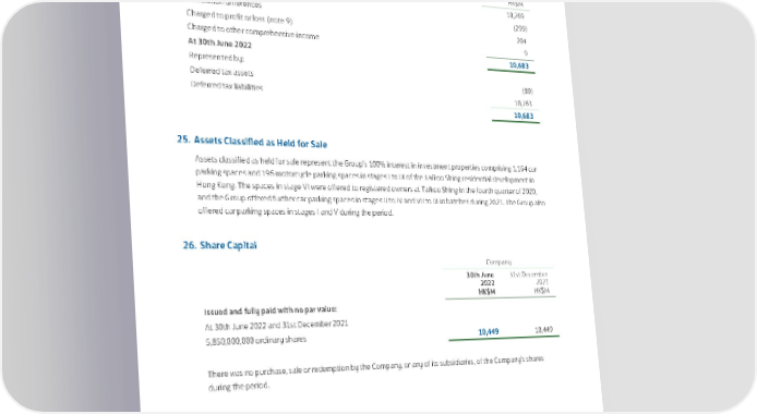 24. Deferred Taxation The movement on the net deferred tax liabilities account is as follows: HK$M At 1st January 2022 10,769 Translation differences (299) Charged to profit or loss (note 9) 204 Charged to other comprehensive income 9 At 30th June 2022 10,683 Represented by: Deferred tax assets (80) Deferred tax liabilities 10,763 10,683 25. Assets Classified as Held for Sale Assets classified as held for sale represent the Group’s 100% interest in investment properties comprising 1,164 car parking spaces and 196 motorcycle parking spaces in stages I to IX of the Taikoo Shing residential development in Hong Kong. The spaces in stage VI were offered to registered owners at Taikoo Shing in the fourth quarter of 2020, and the Group offered further car parking spaces in stages II to IV and VII to IX in batches during 2021. The Group also offered car parking spaces in stages I and V during the period. 26. Share Capital Company 30th June 31st December 2022 2021 HK$M HK$M Issued and fully paid with no par value: At 30th June 2022 and 31st December 2021 5,850,000,000 ordinary shares 10,449 10,449 There was no purchase, sale or redemption by the Company, or any of its subsidiaries, of the Company’s shares during the period. 69
