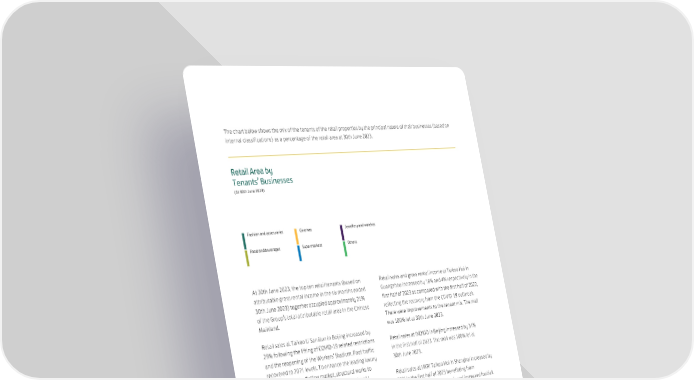 The chart below shows the mix of the tenants of the retail properties by the principal nature of their businesses (based on internal classifications) as a percentage of the retail area at 30th June 2023. Retail Area by Tenants’ Businesses (At 30th June 2023) Fashion and accessories Cinemas Jewellery and watches Food and beverages Supermarkets Others 24.2% At 30th June 2023, the top ten retail tenants (based on Retail sales and gross rental income at Taikoo Hui in attributable gross rental income in the six months ended Guangzhou increased by 16% and 4% respectively in the 30th June 2023) together occupied approximately 21% first half of 2023 as compared with the first half of 2022, of the Group’s total attributable retail area in the Chinese reflecting the recovery from the COVID-19 outbreak. Mainland. There were improvements to the tenant mix. The mall was 100% let at 30th June 2023. Retail sales at Taikoo Li Sanlitun in Beijing increased by 29% following the lifting of COVID-19 related restrictions Retail sales at INDIGO in Beijing increased by 34% and the reopening of the Workers’ Stadium. Foot traffic in the first half of 2023. The mall was 100% let at recovered to 2021 levels. To enhance the leading luxury 30th June 2023. positioning in the Beijing market, structural works to facilitate the tenant mix improvement at Taikoo Li Retail sales at HKRI Taikoo Hui in Shanghai increased by Sanlitun North are in progress. As a result, gross rental 72% in the first half of 2023 benefitting from income decreased by 5% in the first half of 2023. improvements to the tenant mix and increased footfall. Disregarding changes in the value of the Renminbi, gross Gross rental income decreased by 11% as a result of rental income increased by 1%. The development was certain part of the mall undergoing renovation. The mall 97% let at 30th June 2023. was 96% let at 30th June 2023. Disregarding the impact arising from the incremental Retail sales and footfall grew steadily at Taikoo Li Qiantan shareholding at Sino-Ocean Taikoo Li Chengdu, retail in Shanghai in the first half of 2023. At 30th June 2023, sales and gross rental income increased by 27% and 5%, tenants had committed to take 95% of the retail space respectively, in the first half of 2023. The development and 87% of the lettable retail space was open. was 96% let at 30th June 2023. 31