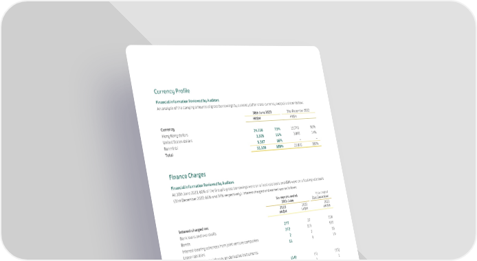 Currency Profile Financial Information Reviewed by Auditors An analysis of the carrying amounts of gross borrowings by currency (after cross-currency swaps) is shown below: 30th June 2023 31st December 2022 HK$M HK$M Currency Hong Kong dollars 24,216 73% 19,740 86% United States dollars 3,505 11% 3,095 14% Renminbi 5,387 16% – – Total 33,108 100% 22,835 100% Finance Charges Financial Information Reviewed by Auditors At 30th June 2023, 60% of the Group’s gross borrowings were on a fixed rate basis and 40% were on a floating rate basis (31st December 2022: 66% and 34% respectively). Interest charged and earned was as follows: Six months ended Year ended 30th June 31st December 2023 2022 2022 HK$M HK$M HK$M Interest charged on: Bank loans and overdrafts 277 27 158 Bonds 272 319 559 Interest-bearing advances from joint venture companies 2 7 16 Lease liabilities 11 9 19 Net fair value (gains)/losses on derivative instruments Cash flow hedges – transferred from other comprehensive income (14) (4) (13) Cross-currency swaps not qualifying as hedges 1 1 1 Other financing costs 57 56 109 606 415 849 Losses on the movement in the fair value of the liability in respect of a put option in favour of the owner of a non-controlling interest 5 27 66 Capitalised on: Investment properties (219) (191) (370) Properties for sale (121) (83) (186) 271 168 359 Interest income on: Short-term deposits and bank balances (29) (66) (105) Loans to joint venture and associated companies (54) (16) (51) Others (9) (7) (16) (92) (89) (172) Net finance charges 179 79 187 49