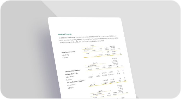 Directors’ Interests At 30th June 2023, the register maintained under Section 352 of the Securities and Futures Ordinance (“SFO”) showed that Directors held the following interests in the shares of Swire Properties Limited and its associated corporations (within the meaning of Part XV of the SFO), John Swire & Sons Limited and Swire Pacific Limited: Capacity Beneficial Interest Percentage Swire Properties Limited Trust Total No. of Voting Personal Family Interest of Shares Shares (%) Note L.K.L. Cheng 1,000 – – 1,000 0.00002 M.B. Swire – – 1,148,812 1,148,812 0.01964 (3) Percentage Capacity of Issued Share Capital Beneficial Interest (comprised John Swire & Sons Limited Trust Total No. in the class) Personal Family Interest of Shares (%) Note Ordinary Shares of £1 N.A.H. Fenwick – – 3,136,000 3,136,000 3.14 (1) M.B. Swire 2,193,550 630,000 14,569,960 17,393,510 17.39 (2) 8% Cum. Preference Shares of £1 N.A.H. Fenwick – – 2,822,400 2,822,400 3.14 (1) M.B. Swire 3,966,125 – 11,904,363 15,870,488 17.63 (2) Percentage Capacity of Voting Shares Beneficial Interest (comprised Swire Pacific Limited Trust Total No. in the class) Personal Family Interest of Shares (%) Note ‘A’ shares L.K.L. Cheng 10,000 – – 10,000 0.0012 M.B. Swire 180,000 – 301,000 481,000 0.0561 (3) ‘B’ shares M.B. Swire 390,000 – 3,024,617 3,414,617 0.1168 (2) Notes: (1) N.A.H. Fenwick was a trustee of a trust which held 3,136,000 ordinary shares and 2,822,400 preference shares in John Swire & Sons Limited included under trust interest and did not have any beneficial interest in those shares. (2) M.B. Swire was a trustee and/or a potential beneficiary of trusts which held 3,246,624 ordinary shares and 1,691,961 preference shares in John Swire & Sons Limited and 1,225,395 ‘B’ shares in Swire Pacific Limited included under trust interest and did not have any beneficial interest in those shares. M.B. Swire was one of the executors of a will which held 1,799,222 ‘B’ shares in Swire Pacific Limited included under trust interest and did not have any beneficial interest in those shares. (3) All shares held by M.B. Swire under trust interest were held by him as one of the executors of a will and he did not have any beneficial interest in those shares. 81