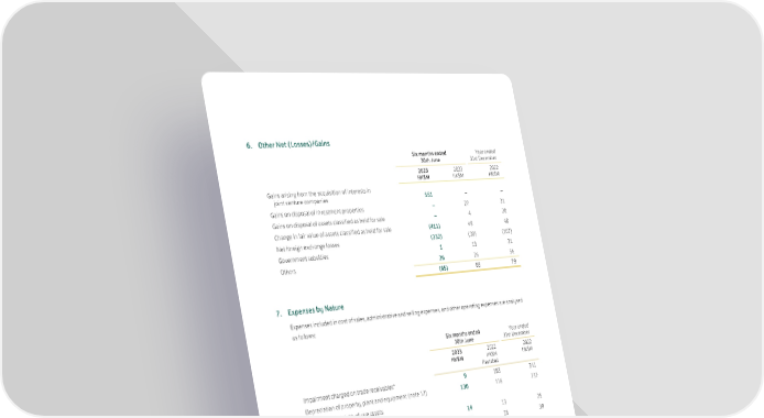 6. Other Net (Losses)/Gains Six months ended Year ended 30th June 31st December 2023 2022 2022 HK$M HK$M HK$M Gains arising from the acquisition of interests in joint venture companies 551 – – Gains on disposal of investment properties – 27 31 Gains on disposal of assets classified as held for sale – 4 20 Change in fair value of assets classified as held for sale (411) 49 48 Net foreign exchange losses (232) (30) (107) Government subsidies 1 13 31 Others 26 26 56 (65) 89 79 7. Expenses by Nature Expenses included in cost of sales, administrative and selling expenses, and other operating expenses are analysed as follows: Six months ended Year ended 30th June 31st December 2023 2022 2022 HK$M HK$M HK$M Restated Impairment charged on trade receivables* 9 183 341 Depreciation of property, plant and equipment (note 12) 130 116 232 Depreciation of right-of-use assets – leasehold land held for own use 14 13 25 – property 22 18 39 Amortisation of – intangible assets (note 14) 32 25 53 – initial leasing costs in respect of investment properties 69 16 79 Staff costs 1,041 1,059 1,899 Other lease expenses** 16 16 32 * These impairments include expected credit loss on the operating lease receivables in relation to the forgiveness of lease payments, i.e. rent concessions granted to tenants during the period, under HKFRS 9 of HK$13 million (30th June 2022 (Restated): HK$178 million; year ended 31st December 2022: HK$319 million). ** These expenses include expenses relating to short-term leases and leases of low-value assets, net of rent concessions received (nil for the six months ended 30th June 2023, 30th June 2022 and year ended 31st December 2022). They are directly charged to the consolidated statement of profit or loss and are not included in the measurement of lease liabilities under HKFRS 16. 63