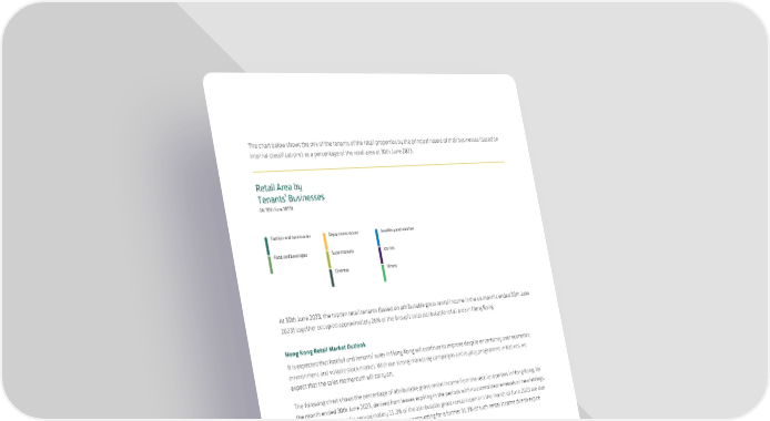 The chart below shows the mix of the tenants of the retail properties by the principal nature of their businesses (based on internal classifications) as a percentage of the retail area at 30th June 2023. Retail Area by Tenants’ Businesses (At 30th June 2023) Fashion and accessories Department stores Jewellery and watches Food and beverages Supermarkets Ice rink Cinemas Others At 30th June 2023, the top ten retail tenants (based on attributable gross rental income in the six months ended 30th June 2023) together occupied approximately 26% of the Group’s total attributable retail area in Hong Kong. Hong Kong Retail Market Outlook It is expected that footfall and tenants’ sales in Hong Kong will continue to improve despite uncertainty over economic environment and volatile stock market. With our strong marketing campaigns and loyalty programme initiatives, we expect that the sales momentum will carry on. The following chart shows the percentage of attributable gross rental income from the retail properties in Hong Kong, for the month ended 30th June 2023, derived from leases expiring in the periods with no committed renewals or new lettings. Tenancies accounting for approximately 11.3% of the attributable gross rental income in the month of June 2023 are due to expire in the second half of 2023, with tenancies accounting for a further 31.3% of such rental income due to expire in 2024. Retail Lease Expiry Profile (At 30th June 2023) 27