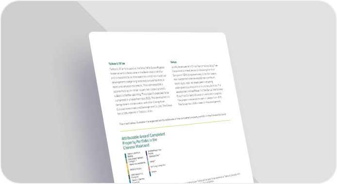 Taikoo Li Xi’an Sanya Taikoo Li Xi’an is located at the Small Wild Goose Pagoda Jointly developed with China Tourism Group Duty Free historical and cultural zone in the Beilin district of Xi’an Corporation Limited, the land in Haitang district of and is expected to be developed as a retail-led mixed-use Sanya with GFA of approximately 2.2 million square development comprising retail and cultural facilities, a feet is expected to be developed into a premium, hotel and serviced residences. The estimated GFA is resort-style, retail-led development including approximately 2.4 million square feet (above ground), underground parking and other ancillary facilities. The subject to further planning. The project is expected to be development will be Phase III of the Sanya International completed in phases from late 2025. The development is Duty-Free Complex. Excavation works are in progress. being done in collaboration with Xi’an Cheng Huan The project is expected to open in phases from 2025. Cultural Investment and Development Co., Ltd. The Group The Group has a 50% interest in this development. has a 70% interest in Taikoo Li Xi’an. The chart below illustrates the expected attributable area of the completed property portfolio in the Chinese Mainland. Attributable Area of Completed Property Portfolio in the Chinese Mainland Taikoo Li Sanlitun, INDIGO Phase Two, Beijing Beijing (2) Sino-Ocean Taikoo Li Taikoo Li Xi’an (1) Chengdu (3) Taikoo Hui, Guangzhou Sanya INDIGO, Beijing Hui Fang, Guangzhou HKRI Taikoo Hui, Others Shanghai Taikoo Li Qiantan, Shanghai (1) In February 2023, the Group acquired the remaining 35% interest in Sino-Ocean Taikoo Li Chengdu (to be renamed as Taikoo Li Chengdu with effect from 23rd August 2023). The Group’s interest increased from 65% to 100% after the transaction. (2) The development is expected to open in phases from late 2025. (3) The development is expected to open in phases from 2025. Others ZHANGYUAN, Shanghai In 2021, the Group formed a joint venture management company with Shanghai Jing’an Real Estate (Group) Co., Ltd. This company, in which the Group has a 60% interest, is engaged in the revitalisation and management of the ZHANGYUAN shikumen compound in the Jing’an district of Shanghai. When the revitalisation is completed, the compound will have a GFA (including car parking spaces) of 591,189 square feet above ground and 738,066 square feet underground. There are over 40 shikumen blocks, with about 170 two or three-storey houses. There are connections to three metro lines and to HKRI Taikoo Hui. The first phase (the West zone) was completed and opened in November 2022. Construction and renovation at the second phase (the East zone) are in progress. The second phase is planned to be completed and opened in 2026. The Group does not have an ownership interest in the compound. 35