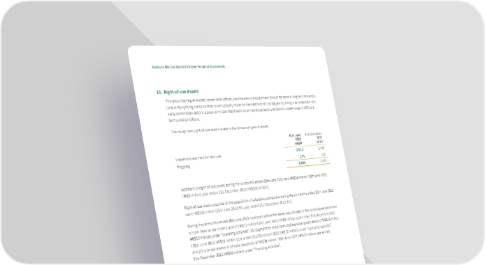Notes to the Condensed Interim Financial Statements 15. Right-of-use Assets The Group (acting as lessee) leases land, offices, warehouses and equipment. Except for certain long-term leasehold land in Hong Kong, rental contracts are typically made for fixed periods of 1 to 50 years but may have extension and early termination options. Lease terms are negotiated on an individual basis and contain a wide range of different terms and conditions. The recognised right-of-use assets relate to the following types of assets: 30th June 31st December 2023 2022 HK$M HK$M Leasehold land held for own use 2,512 2,340 Property 174 142 2,686 2,482 Additions to right-of-use assets during the six months ended 30th June 2023 were HK$56 million (30th June 2022: HK$9 million; year ended 31st December 2022: HK$107 million). Right-of-use assets acquired at the acquisition of subsidiary companies during the six months ended 30th June 2023 were HK$105 million (30th June 2022: Nil; year ended 31st December 2022: Nil). During the six months ended 30th June 2023, total cash outflow for leases was included in the consolidated statement of cash flows as (a) interest paid of HK$11 million (30th June 2022: HK$9 million; year ended 31st December 2022: HK$19 million) under “operating activities”, (b) payment for short-term and low-value assets leases of HK$16 million (30th June 2022: HK$16 million; year ended 31st December 2022: HK$32 million) under “operating activities” and (c) principal elements of lease payments of HK$38 million (30th June 2022: HK$33 million; year ended 31st December 2022: HK$66 million) under “financing activities”. 68 Swire Properties Limited Interim Report 2023