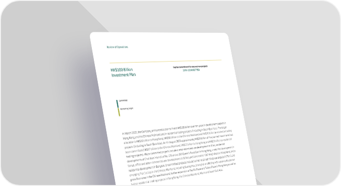 Review of Operations HK$100 Billion Capital commitment for secured new projects Investment Plan 39% COMMITTED Committed Remaining target In March 2022, the Company announced a plan to invest HK$100 billion over ten years in development projects in Hong Kong and the Chinese Mainland and in residential trading projects (including in South East Asia). The target allocation is HK$30 billion to Hong Kong, HK$50 billion to the Chinese Mainland and HK$20 billion to residential trading projects (including in South East Asia). At 4th August 2023 approximately HK$39 billion of the planned investments had been committed (HK$17 billion to the Chinese Mainland, HK$11 billion to Hong Kong and HK$11 billion to residential trading projects). Major committed projects include a retail-led mixed-use development in Xi’an, residential developments at Chai Wan Inland Lot No. 178 and at 269 Queen’s Road East in Hong Kong, a retail-led development in Sanya, office and other commercial use developments at 8 Shipyard Lane and at 1067 King’s Road in Hong Kong, and a residential development in Bangkok. Uncommitted projects include further retail-led mixed-use projects in Tier 1 and emerging Tier 1 cities in the Chinese Mainland, including Guangzhou, Shanghai and Beijing with a plan to double our gross floor area in the Chinese Mainland, further expansion at Pacific Place and Taikoo Place in Hong Kong as well as further residential trading projects in Hong Kong, the Chinese Mainland, Miami and South East Asia. 20 Swire Properties Limited Interim Report 2023