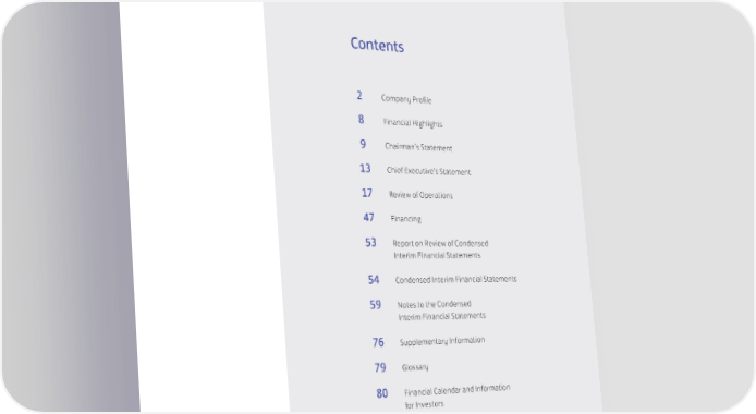 Contents 2 Company Profile 8 Financial Highlights 9 Chairman’s Statement 13 Chief Executive’s Statement 17 Review of Operations 47 Financing 53 Report on Review of Condensed Interim Financial Statements 54 Condensed Interim Financial Statements 59 Notes to the Condensed Interim Financial Statements 76 Supplementary Information 79 Glossary 80 Financial Calendar and Information for Investors