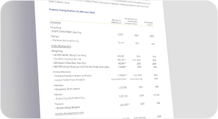 Property Trading Overview The trading portfolio comprises completed units available for sale at EIGHT STAR STREET in Hong Kong and The River in Vietnam. There are nine residential projects under development, four in Hong Kong, two in the Chinese Mainland, one in Indonesia, one in Vietnam and one in Thailand. There is also a plan to develop a residential project on part of our land banks in Miami, U.S.A. Property Trading Portfolio (At 30th June 2024) Actual/Expected GFA (sq. ft.) Construction Attributable (100% Basis) Completion Date Interest Completed Hong Kong – EIGHT STAR STREET, Wan Chai 2,178 (1) 2022 100% Vietnam (1) – The River, Ho Chi Minh City 9,114 2022 20% Under Development Hong Kong – LA MONTAGNE, Wong Chuk Hang 638,305 2024 25% (2) – Chai Wan Inland Lot No. 178 692,276 from 2025 80% (3) – 269 Queen’s Road East, Wan Chai 102,984 2026 100% (4) – 983-987A King’s Road and 16-94 Pan Hoi Street, Quarry Bay 440,000 2028 50% Chinese Mainland (5) – Shanghai New Bund Mixed-use Project 1,159,057 from 2025 40% – Lujiazui Taikoo Yuan, Shanghai to be determined under planning 40% Indonesia – Savyavasa, South Jakarta 1,122,728 2024 50% Vietnam – Empire City, Ho Chi Minh City 5,357,318 2029 15.73% Thailand (4) – Wireless Road, Bangkok 1,631,507 2029 40% Held for Development or sale U.S.A. – South Brickell Key, Miami, Florida 550,000 under planning 100% (6) – Brickell City Centre, Miami, Florida – North Squared site 523,000 n.a. 100% (1) Remaining saleable area. (2) Excluding a retail shop of approximately 2,002 sq. ft. (3) Excluding a retail podium of approximately 13,197 sq. ft. (4) Total GFA subject to change. (5) Residential GFA only. (6) Represents saleable area. 39
