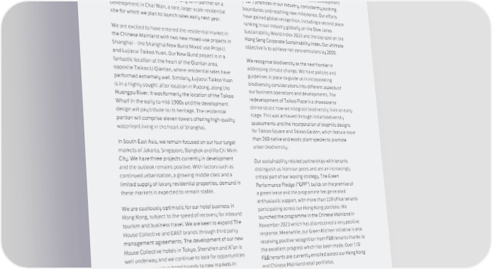 We are currently busy developing a strong and diverse Pioneering Sustainable pipeline of four residential projects on Hong Kong island. Development Practices “LA MONTAGNE” at The Southside in Wong Chuk Hang was launched for sale in 2023, and we are at the design We remain at the forefront of sustainable development stage for a new residential project at 269 Queen’s Road (“SD”) practices in our industry, consistently pushing East. We are also working with a long term partner on a boundaries and reaching new milestones. Our efforts development in Chai Wan, a rare, large-scale residential have gained global recognition, including a second place site for which we plan to launch sales early next year. ranking in our industry globally on the Dow Jones We are excited to have entered the residential market in Sustainability World Index 2023 and the top spot on the the Chinese Mainland with two new mixed-use projects in Hang Seng Corporate Sustainability Index. Our ultimate Shanghai – the Shanghai New Bund Mixed-use Project objective is to achieve net-zero emissions by 2050. and Lujiazui Taikoo Yuan. Our New Bund project is in a We recognise biodiversity as the next frontier in fantastic location at the heart of the Qiantan area, addressing climate change. We have policies and opposite Taikoo Li Qiantan, where residential sales have guidelines in place to guide us in incorporating performed extremely well. Similarly, Lujiazui Taikoo Yuan biodiversity considerations into different aspects of is in a highly sought-after location in Pudong, along the our business operations and developments. The Huangpu River. It was formerly the location of the Taikoo redevelopment of Taikoo Place is a showcase to Wharf in the early to mid-1900s and the development demonstrate how we integrate biodiversity from an early design will pay tribute to its heritage. The residential stage. This was achieved through initial biodiversity portion will comprise eleven towers offering high-quality assessments and the incorporation of biophilic designs waterfront living in the heart of Shanghai. for Taikoo Square and Taikoo Garden, which feature more In South East Asia, we remain focused on our four target than 260 native and exotic plant species to promote markets of Jakarta, Singapore, Bangkok and Ho Chi Minh urban biodiversity. City. We have three projects currently in development Our sustainability-related partnerships with tenants and the outlook remains positive. With factors such as distinguish us from our peers and are an increasingly continued urbanisation, a growing middle class and a critical part of our leasing strategy. The Green limited supply of luxury residential properties, demand in Performance Pledge (“GPP”) builds on the premise of these markets is expected to remain stable. a green lease and the programme has generated We are cautiously optimistic for our hotel business in enthusiastic support, with more than 110 office tenants Hong Kong, subject to the speed of recovery for inbound participating across our Hong Kong portfolio. We tourism and business travel. We are keen to expand The launched the programme in the Chinese Mainland in House Collective and EAST brands through third party November 2023 which has also received a very positive management agreements. The development of our new response. Meanwhile, our Green Kitchen Initiative is also House Collective hotels in Tokyo, Shenzhen and Xi’an is receiving positive recognition from F&B tenants thanks to well underway and we continue to look for opportunities the excellent progress which has been made. Over 110 to introduce our two hotel brands to new markets in F&B tenants are currently enrolled across our Hong Kong the region. and Chinese Mainland retail portfolios. 15