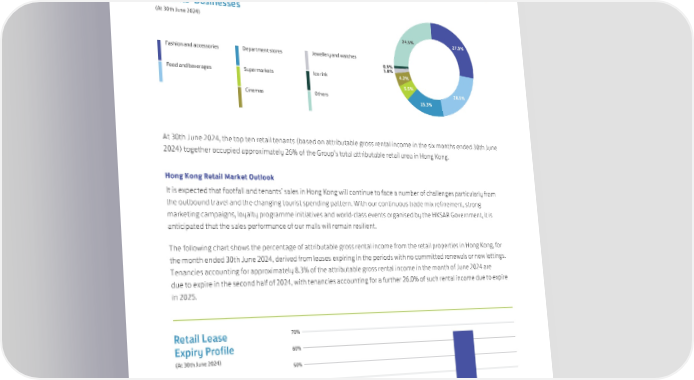 The chart below shows the mix of the tenants of the retail properties by the principal nature of their businesses (based on internal classifications) as a percentage of the retail area at 30th June 2024. Retail Area by Tenants’ Businesses (At 30th June 2024) 24.5% 27.3% Fashion and accessories Department stores Jewellery and watches 0.9% 1.8% Food and beverages Supermarkets Ice rink 4.2% 5.5% Cinemas Others 20.5% 15.3% At 30th June 2024, the top ten retail tenants (based on attributable gross rental income in the six months ended 30th June 2024) together occupied approximately 26% of the Group’s total attributable retail area in Hong Kong. Hong Kong Retail Market Outlook It is expected that footfall and tenants’ sales in Hong Kong will continue to face a number of challenges particularly from the outbound travel and the changing tourist spending pattern. With our continuous trade mix refinement, strong marketing campaigns, loyalty programme initiatives and world-class events organised by the HKSAR Government, it is anticipated that the sales performance of our malls will remain resilient. The following chart shows the percentage of attributable gross rental income from the retail properties in Hong Kong, for the month ended 30th June 2024, derived from leases expiring in the periods with no committed renewals or new lettings. Tenancies accounting for approximately 8.3% of the attributable gross rental income in the month of June 2024 are due to expire in the second half of 2024, with tenancies accounting for a further 26.0% of such rental income due to expire in 2025. Retail Lease 70% Expiry Profile 60% (At 30th June 2024) 50% 40% 30% 20% 10% 0 July – December 2024 2025 2026 and later 27