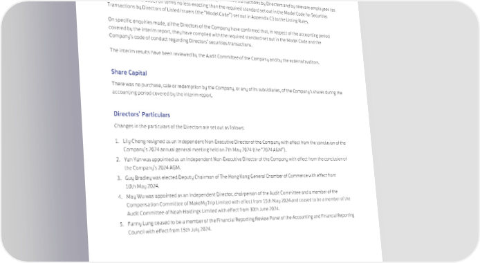 Supplementary Information Corporate Governance The Company complied with all the code provisions set out in the Corporate Governance Code (the “CG Code”) contained in Part 2 of Appendix C1 to the Listing Rules throughout the accounting period covered by the interim report. The Company has adopted codes of conduct regarding securities transactions by Directors and by relevant employees (as defined in the CG Code) on terms no less exacting than the required standard set out in the Model Code for Securities Transactions by Directors of Listed Issuers (the “Model Code”) set out in Appendix C3 to the Listing Rules. On specific enquiries made, all the Directors of the Company have confirmed that, in respect of the accounting period covered by the interim report, they have complied with the required standard set out in the Model Code and the Company’s code of conduct regarding Directors’ securities transactions. The interim results have been reviewed by the Audit Committee of the Company and by the external auditors. Share Capital There was no purchase, sale or redemption by the Company, or any of its subsidiaries, of the Company’s shares during the accounting period covered by the interim report. Directors’ Particulars Changes in the particulars of the Directors are set out as follows: 1. Lily Cheng resigned as an Independent Non-Executive Director of the Company with effect from the conclusion of the Company’s 2024 annual general meeting held on 7th May 2024 (the “2024 AGM”). 2. Yan Yan was appointed as an Independent Non-Executive Director of the Company with effect from the conclusion of the Company’s 2024 AGM. 3. Guy Bradley was elected Deputy Chairman of The Hong Kong General Chamber of Commerce with effect from 10th May 2024. 4. May Wu was appointed as an Independent Director, chairperson of the Audit Committee and a member of the Compensation Committee of MakeMyTrip Limited with effect from 15th May 2024 and ceased to be a member of the Audit Committee of Noah Holdings Limited with effect from 30th June 2024. 5. Fanny Lung ceased to be a member of the Financial Reporting Review Panel of the Accounting and Financial Reporting Council with effect from 15th July 2024. 76 Swire Properties Limited Interim Report 2024