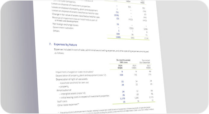 6. Other Net Losses Six months ended Year ended 30th June 31st December 2024 2023 2023 HK$M HK$M HK$M Gains arising from the acquisition of interests in joint venture companies – 551 551 Losses on disposal of investment properties – – (16) Losses on disposal of property, plant and equipment (1) – (2) Losses on disposal of assets classified as held for sale (219) – (44) Change in fair value of assets classified as held for sale (2) (411) (442) Reversal of impairment loss on hotel held as part of a mixed-use development 15 – – Net foreign exchange losses – (232) (240) Government subsidies 1 1 8 Others 103 26 71 (103) (65) (114) 7. Expenses by Nature Expenses included in cost of sales, administrative and selling expenses, and other operating expenses are analysed as follows: Six months ended Year ended 30th June 31st December 2024 2023 2023 HK$M HK$M HK$M Impairment charged on trade receivables* 6 9 40 Depreciation of property, plant and equipment (note 12) 150 130 275 Depreciation of right-of-use assets – leasehold land held for own use 15 14 29 – property 24 22 49 Amortisation of – intangible assets (note 14) 34 32 66 – initial leasing costs in respect of investment properties 26 69 96 Staff costs 1,170 1,041 2,115 Other lease expenses** 15 16 31 * The amounts include impairment charges relating to expected credit losses on forgiveness of lease payments of operating lease receivables, i.e. rent concessions granted to tenants during the period, under HKFRS 9 of HK$4 million (30th June 2023: HK$13 million; year ended 31st December 2023: HK$36 million). ** These expenses include expenses relating to short-term leases and leases of low-value assets, net of rent concessions received (nil for the six months ended 30th June 2024, 30th June 2023 and year ended 31st December 2023). They are directly charged to the consolidated statement of profit or loss and are not included in the measurement of lease liabilities under HKFRS 16. 8. Net Finance Charges Refer to the table with the heading “Financial Information Reviewed by Auditors” on page 51 for details of the Group’s net finance charges. 63