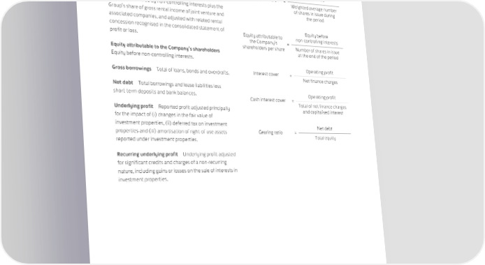 Glossary Terms Ratios References in this document to Hong Kong are to Hong Profit attributable Kong SAR (“HKSAR”). to the Company’s Earnings per share shareholders Attributable gross rental income Gross rental income = Weighted average number less amount shared by non-controlling interests plus the of shares in issue during Group’s share of gross rental income of joint venture and the period associated companies, and adjusted with related rental concession recognised in the consolidated statement of Equity attributable to Equity before profit or loss. the Company’s = non-controlling interests shareholders per share Number of shares in issue Equity attributable to the Company’s shareholders at the end of the period Equity before non-controlling interests. Gross borrowings Total of loans, bonds and overdrafts. Interest cover = Operating profit Net finance charges Net debt Total borrowings and lease liabilities less short-term deposits and bank balances. Cash interest cover = Operating profit Underlying profit Reported profit adjusted principally Total of net finance charges and capitalised interest for the impact of (i) changes in the fair value of investment properties, (ii) deferred tax on investment Net debt properties and (iii) amortisation of right-of-use assets Gearing ratio = Total equity reported under investment properties. Recurring underlying profit Underlying profit adjusted for significant credits and charges of a non-recurring nature, including gains or losses on the sale of interests in investment properties. 79