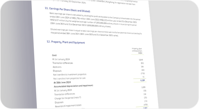 10. Dividends (continued) The register of members will be closed on Friday, 6th September 2024, during which day no transfer of shares will be effected. In order to qualify for entitlement to the first interim dividend, all transfer forms accompanied by the relevant share certificates must be lodged with the Company’s share registrars, Computershare Hong Kong Investor Services Limited, 17th Floor, Hopewell Centre, 183 Queen’s Road East, Hong Kong, for registration not later than 4:30 p.m. on Thursday, 5th September 2024. 11. Earnings Per Share (Basic and Diluted) Basic earnings per share is calculated by dividing the profit attributable to the Company’s shareholders for the period ended 30th June 2024 of HK$1,796 million (30th June 2023: HK$2,223 million; year ended 31st December 2023: HK$2,637 million) by the weighted average number of 5,850,000,000 ordinary shares in issue during the period (30th June 2023 and 31st December 2023: 5,850,000,000 ordinary shares). Diluted earnings per share is equal to basic earnings per share as there was no dilutive potential share outstanding for the period ended 30th June 2024 (30th June 2023 and 31st December 2023: same). 12. Property, Plant and Equipment Property, plant and equipment HK$M Cost: At 1st January 2024 6,849 Translation differences (82) Additions 106 Disposals (26) Net transfers to investment properties (710) Net transfers from properties for sale 51 At 30th June 2024 6,188 Accumulated depreciation and impairment: At 1st January 2024 3,205 Translation differences (38) Charge for the period (note 7) 150 Disposals (25) Reversal of impairment losses (15) Transfer to investment properties (470) At 30th June 2024 2,807 Net book value: At 30th June 2024 3,381 At 1st January 2024 3,644 Property, plant and equipment are reviewed for impairment whenever events or changes in circumstances indicate that the carrying amount may not be recoverable. 65
