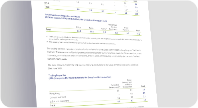 Review of Operations Investment Properties and Hotels Under Development or Held for Future Development (expected GFA attributable to the Group in million square feet) Residential/ Serviced Under (1) Apartments Planning Total Office Retail Hotels Hong Kong – – – – 0.8 0.8 Chinese Mainland 1.6 2.5 0.1 – 3.7 7.9 U.S.A. – – – – 1.5(2) 1.5 Total 1.6 2.5 0.1 – 6.0 10.2 Total Investment Properties and Hotels (GFA (or expected GFA) attributable to the Group in million square feet) Residential/ Serviced Under (1) Office Retail Hotels Apartments Planning Total Total 13.9 11.6 2.3 0.8 6.0 34.6 (1) Hotels are accounted for in the financial statements under property, plant and equipment and, where applicable, the leasehold land portion is accounted for under right-of-use assets. (2) This property is accounted for under properties held for development in the financial statements. The trading portfolio comprises completed units available for sale at EIGHT STAR STREET in Hong Kong and The River in Vietnam. There are nine residential projects under development, four in Hong Kong, two in the Chinese Mainland, one in Indonesia, one in Vietnam and one in Thailand. There is also a plan to develop a residential project on part of our land banks in Miami, U.S.A. The table below illustrates the GFA (or expected GFA) attributable to the Group of the trading property portfolio at 30th June 2024. Trading Properties (GFA (or expected GFA) attributable to the Group in million square feet) Under Development Completed or Held for Development (1) Development Total Hong Kong 0.0 1.1 1.1 Chinese Mainland – 0.5 0.5 U.S.A. and elsewhere 0.0 3.1 3.1 Total 0.0 4.7 4.7 (1) Completed development in Hong Kong comprises EIGHT STAR STREET and completed development in U.S.A. and elsewhere comprises The River in Vietnam. 22 Swire Properties Limited Interim Report 2024