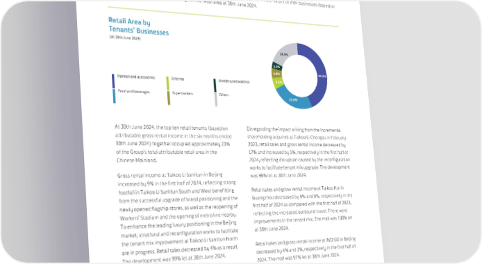 The Group’s gross rental income from retail properties in the Chinese Mainland increased by 10%, to HK$2,238 million, in the first half of 2024. Disregarding the impact arising from the incremental shareholding acquired at Taikoo Li Chengdu in February 2023 and changes in the value of the Renminbi, gross rental income increased by 2%. The chart below shows the mix of the tenants of the retail properties by the principal nature of their businesses (based on internal classifications) as a percentage of the retail area at 30th June 2024. Retail Area by Tenants’ Businesses (At 30th June 2024) 18.4% 3.3% 4.9% 44.3% Fashion and accessories Cinemas Jewellery and watches 5.5% Food and beverages Supermarkets Others 23.6% At 30th June 2024, the top ten retail tenants (based on Disregarding the impact arising from the incremental attributable gross rental income in the six months ended shareholding acquired at Taikoo Li Chengdu in February 30th June 2024) together occupied approximately 23% 2023, retail sales and gross rental income decreased by of the Group’s total attributable retail area in the 17% and increased by 1%, respectively in the first half of Chinese Mainland. 2024, reflecting disruption caused by the reconfiguration works to facilitate tenant mix upgrade. The development Gross rental income at Taikoo Li Sanlitun in Beijing was 98% let at 30th June 2024. increased by 9% in the first half of 2024, reflecting strong footfall in Taikoo Li Sanlitun South and West benefitting Retail sales and gross rental income at Taikoo Hui in from the successful upgrade of brand positioning and the Guangzhou decreased by 9% and 8%, respectively in the newly opened flagship stores, as well as the reopening of first half of 2024 as compared with the first half of 2023, Workers’ Stadium and the opening of metro line nearby. reflecting the increased outbound travel. There were To enhance the leading luxury positioning in the Beijing improvements in the tenant mix. The mall was 100% let market, structural and reconfiguration works to facilitate at 30th June 2024. the tenant mix improvement at Taikoo Li Sanlitun North are in progress. Retail sales decreased by 4% as a result. Retail sales and gross rental income at INDIGO in Beijing The development was 99% let at 30th June 2024. decreased by 4% and 3%, respectively in the first half of 2024. The mall was 97% let at 30th June 2024. 31