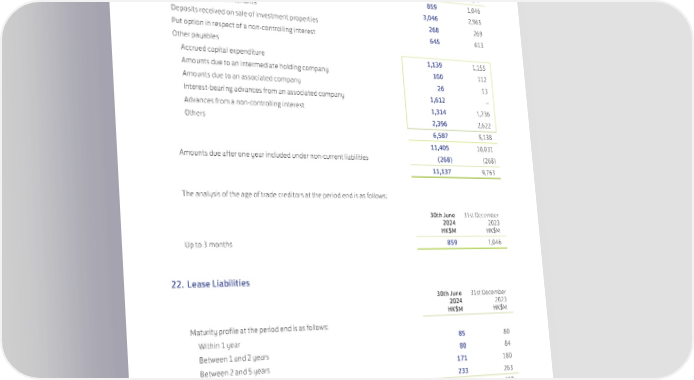 21. Trade and Other Payables 30th June 31st December 2024 2023 HK$M HK$M Trade creditors 859 1,046 Rental deposits from tenants 3,046 2,965 Deposits received on sale of investment properties 268 269 Put option in respect of a non-controlling interest 645 613 Other payables Accrued capital expenditure 1,139 1,155 Amounts due to an intermediate holding company 100 112 Amounts due to an associated company 26 13 Interest-bearing advances from an associated company 1,612 – Advances from a non-controlling interest 1,314 1,236 Others 2,396 2,622 6,587 5,138 11,405 10,031 Amounts due after one year included under non-current liabilities (268) (268) 11,137 9,763 The analysis of the age of trade creditors at the period end is as follows: 30th June 31st December 2024 2023 HK$M HK$M Up to 3 months 859 1,046 22. Lease Liabilities 30th June 31st December 2024 2023 HK$M HK$M Maturity profile at the period end is as follows: Within 1 year 85 80 Between 1 and 2 years 80 84 Between 2 and 5 years 171 180 Over 5 years 233 263 569 607 Amounts due within one year included under current liabilities (85) (80) 484 527 71