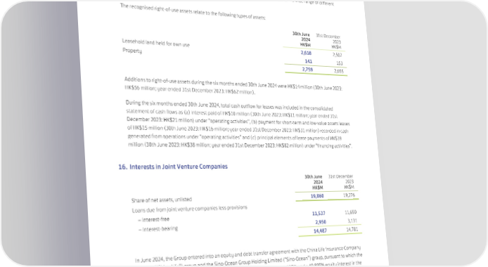 15. Right-of-use Assets The Group (acting as lessee) leases land, offices, warehouses and equipment. Except for certain long-term leasehold land in Hong Kong, rental contracts are typically made for fixed periods of 1 to 50 years but may have extension and early termination options. Lease terms are negotiated on an individual basis and contain a wide range of different terms and conditions. The recognised right-of-use assets relate to the following types of assets: 30th June 31st December 2024 2023 HK$M HK$M Leasehold land held for own use 2,618 2,502 Property 141 153 2,759 2,655 Additions to right-of-use assets during the six months ended 30th June 2024 were HK$14 million (30th June 2023: HK$56 million; year ended 31st December 2023: HK$62 million). During the six months ended 30th June 2024, total cash outflow for leases was included in the consolidated statement of cash flows as (a) interest paid of HK$10 million (30th June 2023: HK$11 million; year ended 31st December 2023: HK$21 million) under “operating activities”, (b) payment for short-term and low-value assets leases of HK$15 million (30th June 2023: HK$16 million; year ended 31st December 2023: HK$31 million) recorded in cash generated from operations under “operating activities” and (c) principal elements of lease payments of HK$39 million (30th June 2023: HK$38 million; year ended 31st December 2023: HK$82 million) under “financing activities”. 16. Interests in Joint Venture Companies 30th June 31st December 2024 2023 HK$M HK$M Share of net assets, unlisted 19,860 19,276 Loans due from joint venture companies less provisions – Interest-free 11,537 11,650 – Interest-bearing 2,950 3,131 14,487 14,781 In June 2024, the Group entered into an equity and debt transfer agreement with the China Life Insurance Company Limited (“China Life”) group and the Sino-Ocean Group Holding Limited (“Sino-Ocean”) group, pursuant to which the Group and the China Life group have conditionally agreed to acquire a 14.895% and a 49.895% equity interest in the project company of INDIGO Phase Two, respectively, from the Sino-Ocean group for a consideration of approximately RMB891 million and RMB2,984 million, respectively. Completion of the acquisitions is subject to the satisfaction of certain conditions precedent. The acquisitions were completed in early August. Following the completion of the acquisitions, the Group’s interest in INDIGO Phase Two has increased from 35% to 49.895% and the China Life group owns a 49.895% interest in INDIGO Phase Two. 67