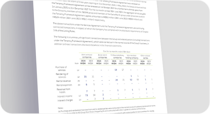 30. Related Party Transactions (continued) Under a tenancy framework agreement (the “Tenancy Framework Agreement”) between JS&SHK, Swire Pacific Limited (“Swire Pacific”) and the Company dated 14th August 2014, members of the Group enter into tenancy agreements with members of the JS&SHK group and members of the Swire Pacific group from time to time on normal commercial terms based on prevailing market rentals. The Tenancy Framework Agreement was renewed on 1st October 2021 for a term of three years expiring on 31st December 2024. In May 2024, the Group announced that the Tenancy Framework Agreement will be renewed on 1st October 2024 for a further term of three years from 1st January 2025 to 31st December 2027. For the six months ended 30th June 2024, the aggregate rentals payable to the Group by members of the JS&SHK group and members of the Swire Pacific group under tenancies to which the Tenancy Framework Agreement applies amounted to HK$52 million (30th June 2023: HK$53 million) and HK$24 million (30th June 2023: HK$21 million) respectively. The above transactions under the Services Agreement and the Tenancy Framework Agreement are continuing connected transactions, in respect of which the Company has complied with the disclosure requirements of Chapter 14A of the Listing Rules. The following is a summary of significant transactions between the Group and related parties (including transactions under the Tenancy Framework Agreement), which were carried out in the normal course of the Group’s business, in addition to those transactions disclosed elsewhere in the financial statements. For the six months ended 30th June Joint venture Associated Fellow subsidiary Intermediate Other related companies companies companies holding company parties 2024 2023 2024 2023 2024 2023 2024 2023 2024 2023 Note HK$M HK$M HK$M HK$M HK$M HK$M HK$M HK$M HK$M HK$M Purchase of services (a) – – – – 19 17 – – – – Rendering of services (a) 35 31 – – – – 1 1 – – Rental revenue (b) – – – – 24 21 52 53 1 1 Rental expenses (b) 6 5 – – – – – – – – Revenue from hotels 7 7 – – 1 2 1 1 2 2 Interest income (c) 73 54 2 – – – – – – – Interest charges (c) – 2 2 – – – – – – – Notes: (a) Purchase and rendering of services from and to related parties were conducted in the normal course of business at prices and on terms no less favourable to the Group than those charged by/to and contracted with other suppliers/customers of the Group. (b) The Group has, in the normal course of its business, entered into lease agreements with related parties to lease premises for varying periods up to six years. The leases were entered into on normal commercial terms. (c) Loans advanced to joint venture and associated companies at 30th June 2024 are disclosed in notes 16 and 17. Advances from associated companies are disclosed in note 21. 75