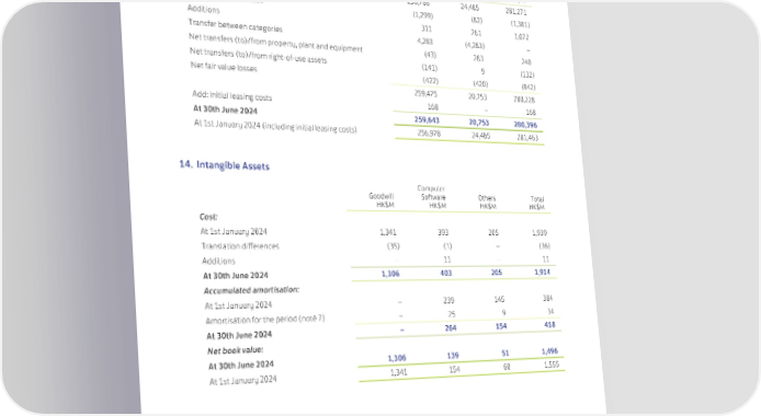 Notes to the Condensed Interim Financial Statements 13. Investment Properties Under Completed Development Total HK$M HK$M HK$M At 1st January 2024 256,786 24,485 281,271 Translation differences (1,299) (82) (1,381) Additions 311 761 1,072 Transfer between categories 4,283 (4,283) – Net transfers (to)/from property, plant and equipment (43) 283 240 Net transfers (to)/from right-of-use assets (141) 9 (132) Net fair value losses (422) (420) (842) 259,475 20,753 280,228 Add: Initial leasing costs 168 – 168 At 30th June 2024 259,643 20,753 280,396 At 1st January 2024 (including initial leasing costs) 256,978 24,485 281,463 14. Intangible Assets Computer Goodwill Software Others Total HK$M HK$M HK$M HK$M Cost: At 1st January 2024 1,341 393 205 1,939 Translation differences (35) (1) – (36) Additions – 11 – 11 At 30th June 2024 1,306 403 205 1,914 Accumulated amortisation: At 1st January 2024 – 239 145 384 Amortisation for the period (note 7) – 25 9 34 At 30th June 2024 – 264 154 418 Net book value: At 30th June 2024 1,306 139 51 1,496 At 1st January 2024 1,341 154 60 1,555 66 Swire Properties Limited Interim Report 2024