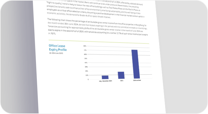 At 30th June 2024, the top ten office tenants (based on attributable gross rental income in the six months ended 30th June 2024) together occupied approximately 23% of the Group’s total attributable office area in Hong Kong. Hong Kong Office Market Outlook The office market in Hong Kong is anticipated to remain weak in the second half of 2024, affected by subdued demand and a surplus of office space in the market. Rents will continue to be under pressure. Nevertheless, the prevailing ‘flight-to-quality’ trend is likely to favour the new office buildings such as Two Taikoo Place and Six Pacific Place, as prospective tenants seek to enhance their office environment, prioritising sustainability and the well-being of their employees as critical office selection criteria. Assuming a positive development in the financial markets and an uptick in economic activities, the demand for Grade-A office space should improve. The following chart shows the percentage of attributable gross rental income from the office properties in Hong Kong, for the month ended 30th June 2024, derived from leases expiring in the periods with no committed renewals or new lettings. Tenancies accounting for approximately 8.4% of the attributable gross rental income in the month of June 2024 are due to expire in the second half of 2024, with tenancies accounting for a further 17.7% of such rental income due to expire in 2025. Office Lease 80% Expiry Profile 70% (At 30th June 2024) 60% 50% 40% 30% 20% 10% 0 July – December 2024 2025 2026 and later 25