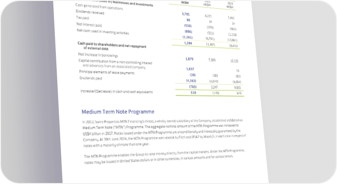 Financing Summary of Cash Flows Six months ended Year ended 30th June 31st December 2024 2023 2023 HK$M HK$M HK$M Net cash from/(used in) businesses and investments Cash generated from operations 3,701 4,221 7,492 Dividends received 80 34 34 Tax paid (530) (370) (963) Net interest paid (806) (511) (1,118) Net cash used in investing activities (1,161) (6,761) (13,861) 1,284 (3,387) (8,416) Cash paid to shareholders and net repayment of external debt Net increase in borrowings 1,879 7,309 15,135 Capital contribution from a non-controlling interest and advances from an associated company 1,657 – 16 Principal elements of lease payments (39) (38) (82) Dividends paid (4,262) (4,024) (6,004) (765) 3,247 9,065 Increase/(Decrease) in cash and cash equivalents 519 (140) 649 Medium Term Note Programme In 2012, Swire Properties MTN Financing Limited, a wholly-owned subsidiary of the Company, established a US$3 billion Medium Term Note (“MTN”) Programme. The aggregate nominal amount of the MTN Programme was increased to US$4 billion in 2017. Notes issued under the MTN Programme are unconditionally and irrevocably guaranteed by the Company. At 30th June 2024, the MTN Programme was rated A by Fitch and (P)A2 by Moody’s, in each case in respect of notes with a maturity of more than one year. The MTN Programme enables the Group to raise money directly from the capital markets. Under the MTN Programme, notes may be issued in United States dollars or in other currencies, in various amounts and for various tenors. 47