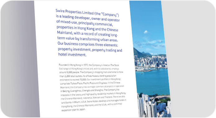Swire Properties Limited (the “Company”) is a leading developer, owner and operator of mixed-use, principally commercial, properties in Hong Kong and the Chinese Mainland, with a record of creating long- term value by transforming urban areas. Our business comprises three elements: property investment, property trading and hotel investment. Founded in Hong Kong in 1972, the Company is listed on The Stock Exchange of Hong Kong Limited and, with its subsidiaries, employs around 5,800 people. The Company’s shopping malls are home to more than 2,200 retail outlets. Its offices house a working population estimated to exceed 70,000. Our investment portfolio in Hong Kong comprises Taikoo Place, Pacific Place and Cityplaza. In the Chinese Mainland, the Company has six major commercial projects in operation in Beijing, Guangzhou, Chengdu and Shanghai. The Company has interests in the luxury and high quality residential markets in Hong Kong, the Chinese Mainland, Indonesia, Vietnam and Thailand. There are also land banks in Miami, U.S.A. Swire Hotels develops and manages hotels in Hong Kong, the Chinese Mainland, and the U.S.A., with a confirmed expansion plan to Japan. 2 Swire Properties Limited Interim Report 2024