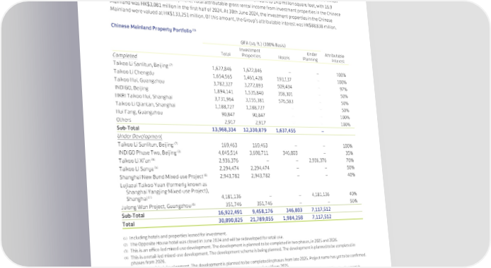 Investment Properties – Chinese Mainland Overview The property portfolio in the Chinese Mainland comprises an aggregate of 30.9 million square feet of space, 18.3 million square feet of which is attributable to the Group. Completed properties amount to 14.0 million square feet, with 16.9 million square feet under development. Total attributable gross rental income from investment properties in the Chinese Mainland was HK$3,081 million in the first half of 2024. At 30th June 2024, the investment properties in the Chinese Mainland were valued at HK$133,251 million. Of this amount, the Group’s attributable interest was HK$88,838 million. Chinese Mainland Property Portfolio (1) GFA (sq. ft.) (100% Basis) Investment Under Attributable Total Properties Hotels Planning Interest Completed Taikoo Li Sanlitun, Beijing (2) 1,622,846 1,622,846 – – 100% Taikoo Li Chengdu 1,654,565 1,461,428 193,137 – 100% Taikoo Hui, Guangzhou 3,782,327 3,272,893 509,434 – 97% INDIGO, Beijing 1,894,141 1,535,840 358,301 – 50% HKRI Taikoo Hui, Shanghai 3,731,964 3,155,381 576,583 – 50% Taikoo Li Qiantan, Shanghai 1,188,727 1,188,727 – – 50% Hui Fang, Guangzhou 90,847 90,847 – – 100% Others 2,917 2,917 – – 100% Sub-Total 13,968,334 12,330,879 1,637,455 – Under Development Taikoo Li Sanlitun, Beijing (2) 169,463 169,463 – – 100% INDIGO Phase Two, Beijing (3) 4,045,514 3,698,711 346,803 – 35% Taikoo Li Xi’an (4) 2,936,376 – – 2,936,376 70% Taikoo Li Sanya (5) 2,294,474 2,294,474 – – 50% Shanghai New Bund Mixed-use Project (6) 2,943,782 2,943,782 – – 40% Lujiazui Taikoo Yuan (formerly known as Shanghai Yangjing Mixed-use Project), Shanghai (7) 4,181,136 – – 4,181,136 40% Julong Wan Project, Guangzhou (8) 351,746 351,746 – – 50% Sub-Total 16,922,491 9,458,176 346,803 7,117,512 Total 30,890,825 21,789,055 1,984,258 7,117,512 (1) Including hotels and properties leased for investment. (2) The Opposite House hotel was closed in June 2024 and will be redeveloped for retail use. (3) This is an office-led mixed-use development. The development is planned to be completed in two phases, in 2025 and 2026. (4) This is a retail-led mixed-use development. The development scheme is being planned. The development is planned to be completed in phases from 2026. (5) This is a retail-led development. The development is planned to be completed in phases from late 2025. Project name has yet to be confirmed. (6) This is a mixed-use development. The development is planned to be completed from 2025. (7) This is a mixed-use development including residential portion for trading. The development scheme is being planned. The development is planned to be completed in phases from 2027. (8) This is the retail portion of a mixed-use development in Liwan district of Guangzhou. GFA as shown above represented the sites acquired as of 30th June 2024. The GFA will increase to approximately 1,615,000 square feet, subject to further relevant transaction agreements. The Group has a 50% interest in the retail portion of the development. The development scheme is being planned. The overall development is planned to be completed in phases from the first half of 2027. Gross rental income from the Group’s investment property portfolio in the Chinese Mainland was HK$2,445 million in the first half of 2024, 9% higher than in the same period in 2023, reflecting the improvement to tenant mix in the cities where our malls operate and share of incremental rental income arising from the acquisitions of additional interests in Taikoo Li Chengdu during 2023, partly offset by lower turnover rents in the first half of 2024. 29