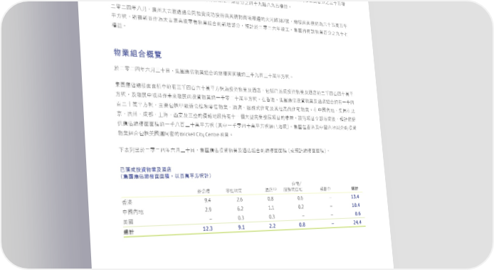 ɚཧɚ̬ϋʬ˜dණྠၾʕɛྪڭᎈٰ΅Ϟࠢʮ̡€˜ʕɛྪ™ණྠʿჃݱණྠછٰϞࠢʮ̡€˜Ⴣݱ™ණྠᖦࠈ ٰᛆʿවᛆᔷᜫᙄdණྠʿʕɛྪණྠʱй˸ߒɛ͏࿆ɞᄂɘɷɓϵຬʩʿɛ͏࿆ɚɤɘᄂɞɷ̬ϵຬʩٙ˾ᄆΣ ჃݱණྠϞૢϗᒅచಥɚಂධͦʮ̡ʘϵʱʘɤ̬ᓃɞɘʞʿϵʱʘ̬ɤɘᓃɞɘʞٰ͉ᛆूd༈ධϗᒅաࠢ߰ ʍӔૢᐏတԑʑঐҁϓf༈ධʹʊɞ˜ڋҁϓfᎇഹʹҁϓܝdණྠచಥɚಂٙᛆू͟ϵʱʘɧɤʞᄣ Їϵʱʘ̬ɤɘᓃɞɘʞdϾʕɛྪණྠܵϞచಥɚಂϵʱʘ̬ɤɘᓃɞɘʞᛆूf 387dᐼᅽࠦࠦጐߒމʬɤʞຬʞɷ ɚཧɚ̬ϋɞ˜dᄿψ˄̚䁩ீཀʮකשርϓ̌ҳၾՉᒅيਠఙஹٙ˂ئ༩ ̻˙ъdਗ਼ᔕอԨЪމ˄̚䁩৷ॴཧਯيุଡ଼ΥٙอᄣʱdཫࠇɚཧɚʬϋംʈfණྠܵϞ༈يุϵʱʘɘɤɖ ᛆूf 物業組合概覽 ɚཧɚ̬ϋʬ˜ɧɤ˚dණྠᏐЦيุଡ଼Υٙᐼᅽࠦࠦጐߒɧɷɘϵɧɤຬ̻˙ъf ණྠᏐЦᐼᅽࠦࠦጐʕߒϞɧɷ̬ϵʬɤຬ̻˙ъމҳ༟يุʿৢֳdܼ̍ʊໝϓҳ༟يุʿৢֳߒɚɷ̬ϵ̬ɤຬ̻ ˙ъdʿ೯࢝ʕאܵЪ͊Ը೯࢝ٙҳ༟يุߒɓɷཧɚɤຬ̻˙ъfί࠰ಥdණྠᏐЦҳ༟يุʿৢֳଡ଼ΥߒϞɓɷ̬ ϵɚɤຬ̻˙ъd˴ࠅܼ̍͠ॴ፬ʮᅽձཧਯيุeৢֳeਕόИσʿՉ˼৷֠Иσيุfίʕʫήdණྠί̏ ԯeᄿψeϓேeɪऎeГτʿɧԭٙᎴ൳ήݬܵϞɤɓࡈɽۨਠุ೯࢝ධͦٙᛆूf༈ഃධͦΌໝϓܝdཫࠇਗ਼ ԶᏐЦᐼᅽࠦࠦጐߒɓɷɞϵɧɤຬ̻˙ъ€Չʕɓɷཧ̬ɤຬ̻˙ъʊໝϓfණྠί࠰ಥʿʕʫή˸̮ٙҳ༟ Brickell City Centreධͦf يุଡ଼Υܼ̍ߕᒕڛٙ ɨڌΐ̈ɚཧɚ̬ϋʬ˜ɧɤ˚dණྠᏐЦҳ༟يุʿৢֳଡ଼Υٙᐼᅽࠦࠦጐ€אཫࠇᐼᅽࠦࠦጐf 已落成投資物業及酒店 (集團應佔總樓面面積,以百萬平方呎計) Иσā (1) ৢֳ ፬ʮᅽ ཧਯيุ ਕόИσ ྌʕ 總計 9.4 2.6 0.8 0.6 – 13.4 ࠰ಥ 2.9 6.2 1.1 0.2 – 10.4 ʕʫή – 0.3 0.3 – – 0.6 ߕ 12.3 9.1 2.2 0.8 – 24.4 總計 21