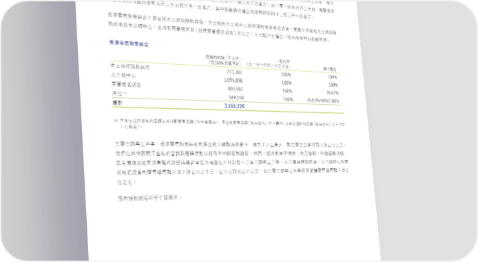 業務評述 ཧਯ ฿ᚎ ܲϵʱʘɓϵމਿࠇd࠰ಥʊໝϓٙཧਯيุଡ଼ΥᐼᅽࠦࠦጐΥމɧϵɚɤຬ̻˙ъfɚཧɚ̬ϋɪ̒ϋdԸІ ණྠ࠰ಥཧਯيุٙᏐЦॡږϗɝᐼᕘɨൻϵʱʘɧЇಥ࿆ɤɚᄂɞɷɞϵຬʩfɚཧɚ̬ϋʬ˜ɧɤ˚dණྠ࠰ಥ ཧਯيุٙП࠽މಥ࿆ʞϵɧɤʞᄂʬɷɚϵຬʩdՉʕණྠᏐЦᛆूމಥ࿆̬ϵ̬ɤɧᄂɧɷɓϵຬʩf ࠰ಥཧਯيุଡ଼Υ˴ࠅܼ̍˄̚ᄿఙᒅيਠఙe˄۬ٙ̚˄۬̚ʕːձ؇गٙ؇⸭۬ΤֳࡑfණྠΌ༟ኹϞ˄̚ᄿఙᒅ يਠఙʿ˄۬̚ʕːdԨܵϞ؇⸭۬ධͦ€ܼ̍؇⸭۬Τֳࡑϵʱʘɚɤʬᓃʬɖᛆूi༈Ԭਠఙѩ͟ණྠ၍ଣf 香港零售物業組合 ᐼᅽࠦࠦጐ€̻˙ъ ॡ͜ଟ €ܲ100%މਿࠇ €ɚཧɚ̬ϋʬ˜ɧɤ˚ ᏐЦᛆू 711,182 100% 100% ˄̚ᄿఙᒅيਠఙ 1,096,898 100% 100% ˄۬̚ʕː 803,582 100% 26.67% ؇⸭۬Τֳࡑ (1) 549,558 100% 26.67%/60%/100% Չ˼ 3,161,220 總計 (1) ˴ࠅܼ̍˄ֳ۬ٙ̚⧕ʿਹཧਯֳ⧕€ѩΌ༟ኹϞeಥ༶۬ཧਯֳ⧕€ܵϞϵʱʘʬɤᛆूʿ؇చᝄऱֳٙ⧕€ܵϞϵʱʘɚɤʬᓃ ʬɖᛆूf ɚཧɚ̬ϋɪ̒ϋd࠰ಥཧਯيุଡ଼Υٙॡږϗɝᐼᕘމಥ࿆ɤɓᄂɘɷɞϵຬʩd༰ɚཧɚɧϋΝಂɨൻϵʱʘɧf Ңࡁίਠఙ࢝කəණٙᐄቖʿપᄿݺਗ˸іˏ͉ήᚥ܄ձ༷܄f್Ͼdۃ౻ʔࣦeߕʩ੶ැe̮༷ᒈැܵᚃe ৷ࢹᐑྤʿ༷܄ऊ൬ᅼόҷᜊܵᚃ࿁ཧਯ̹ఙପ͛ʔлᅂᚤfɚཧɚ̬ϋɪ̒ϋd˄̚ᄿఙᒅيਠఙe˄۬̚ʕːձ؇ ⸭۬Τֳࡑٙཧਯቖਯᕘʱйɨൻϵʱʘɤɧeϵʱʘ̬ʿϵʱʘɧdϾɚཧɚ̬ϋɪ̒ϋ࠰ಥཧਯቖਯᕘɨൻϵ ʱʘɖf ಂʫᒅيਠఙڐ˷Όॡ̈f 26 太古地產有限公司 二零二四年中期報告